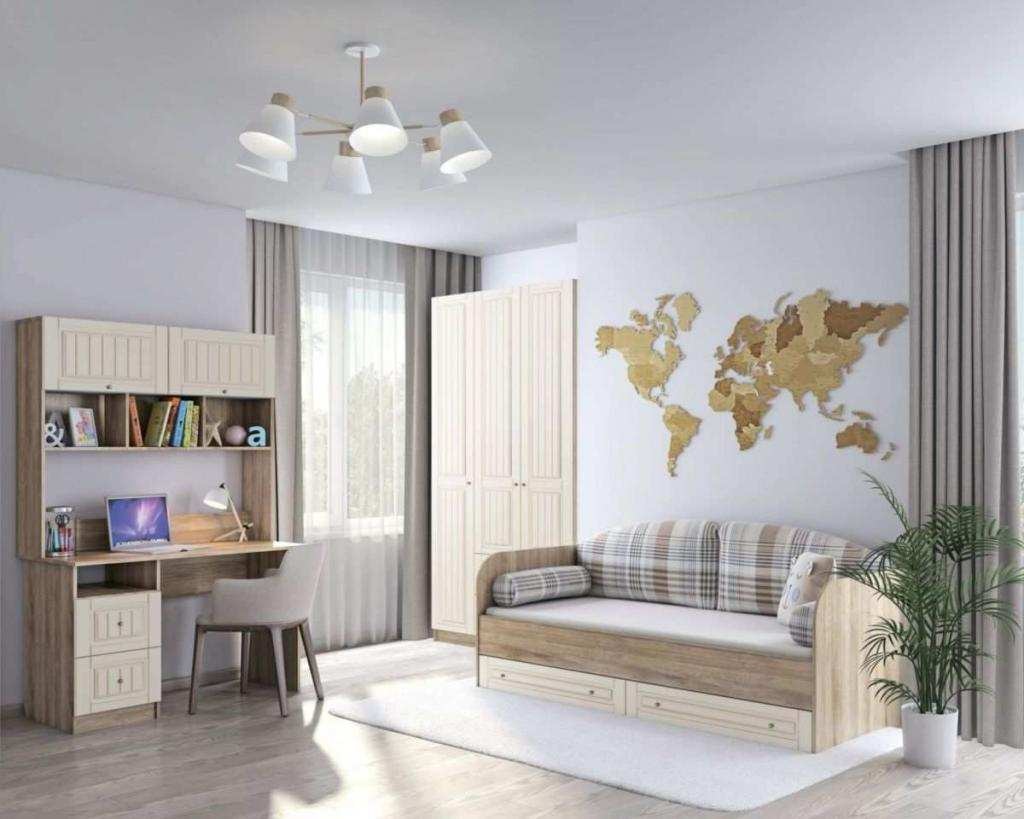 Тёплые тона сделают интерьер комфортным. Каждый элемент продуман до мелочей по функциональности. Интересное исполнение кровати, можно в обычном виде, а можно с мягкими элементами. Обратите внимание на эту новинку.