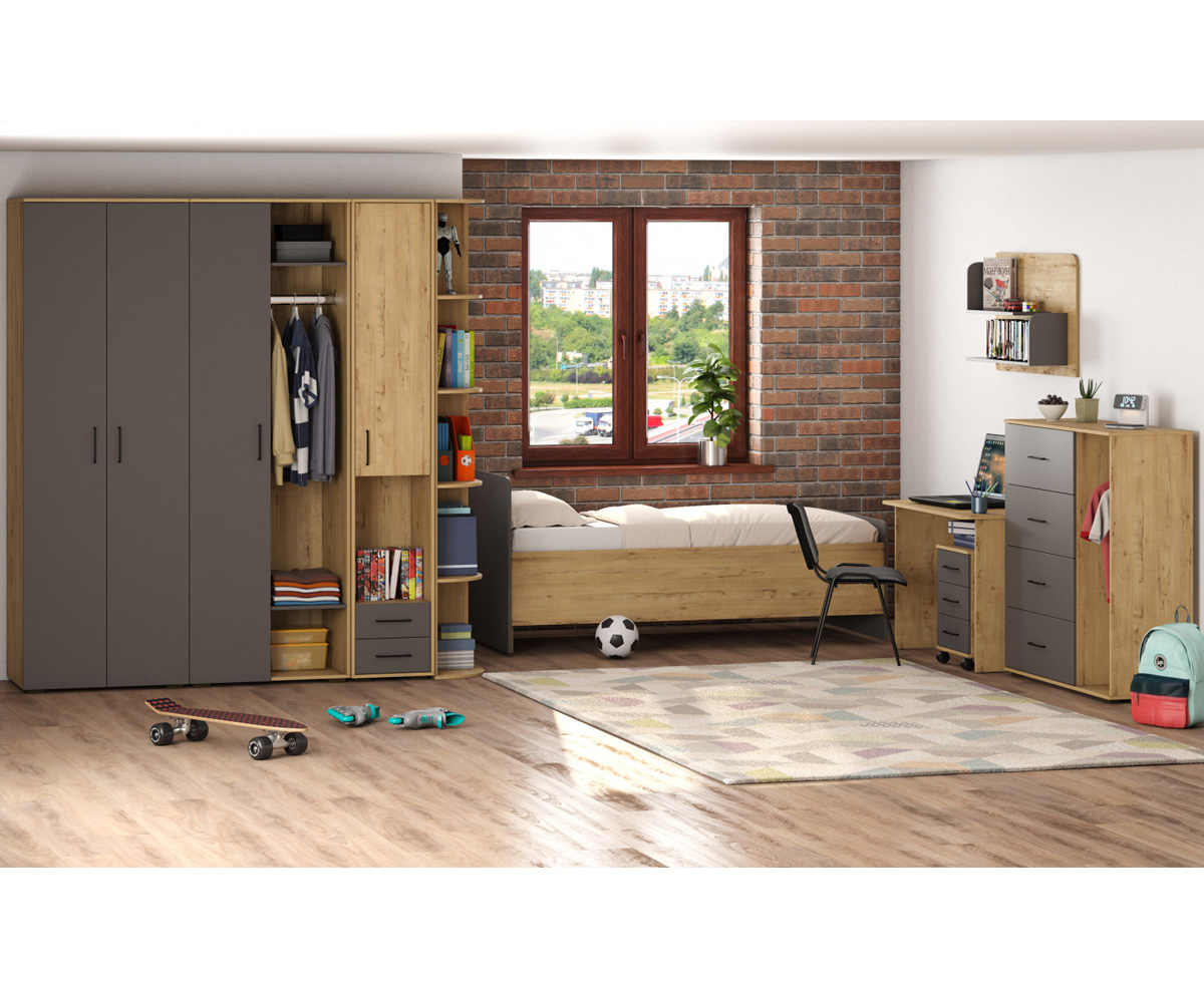 Детская Бруно дополнит вашу детскую и расположит вещи с комфортом. Сочетание древесных тонов с серым в мебели Бруно — одно из самых популярных и универсальных. Серый цвет обладает нейтральностью и успокаивает, а дерево добавляет теплоту и текстуру.