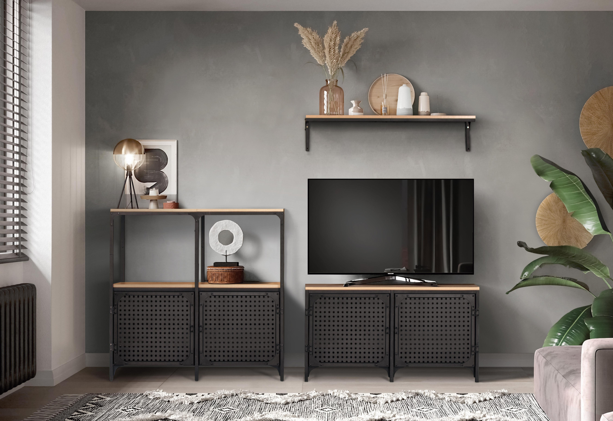 Серия Люмен отлично подойдет для многих квартир. Изделия из перфорированного металлического листа уверенно завоевывают современный рынок. Они долговечные и надежные, их легко переносить, вешать на стены и передвигать. Это практичная мебель как для дома, так и для офисов. В коллекции «Люмен» промышленный дизайн и функциональность идут рука об руку. Черный металл прекрасно сочетается с декором Дуб Вотан, придавая мебели современный вид с ноткой винтажного шарма. Перфорированные фасады облегчают не только вес модулей, но и внешний вид, придавая ему воздушность и изящность.