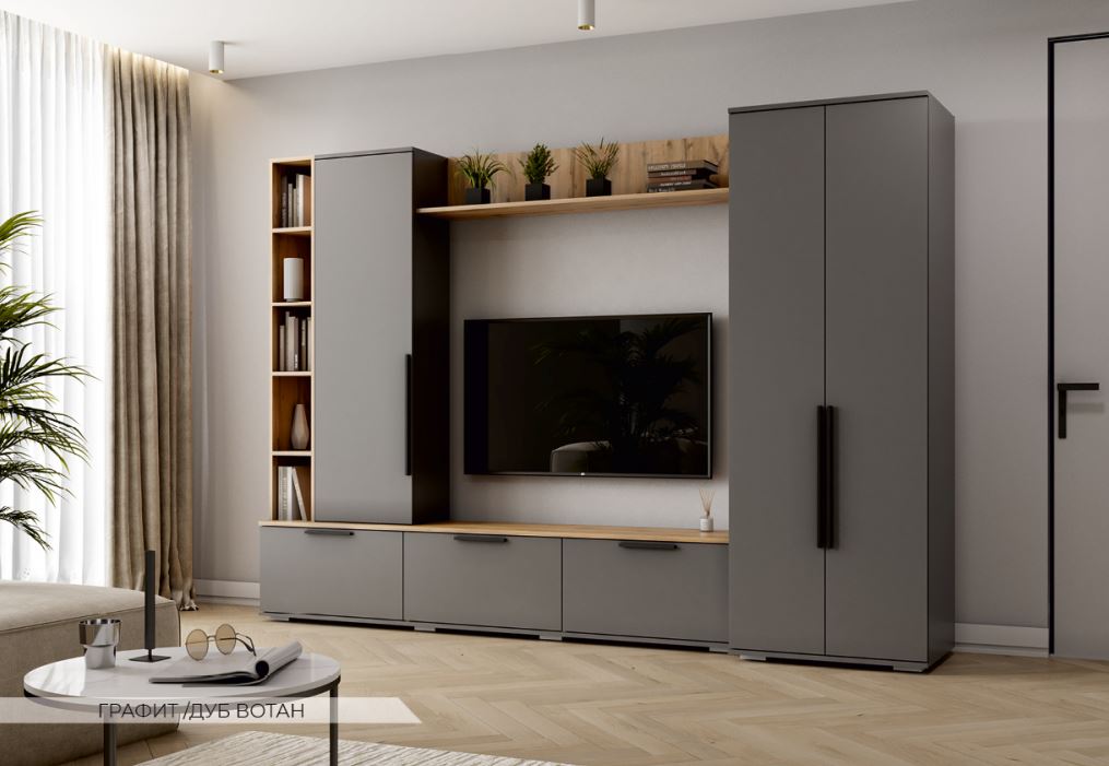 Гостиная Селеста - отличный выбор для стильного и функционального интерьера. Гладкие, матовые поверхности с минималистичным дизайном. Модульность позволяет гибко комбинировать секции для хранения, ТВ-зоны и декоративных элементов.