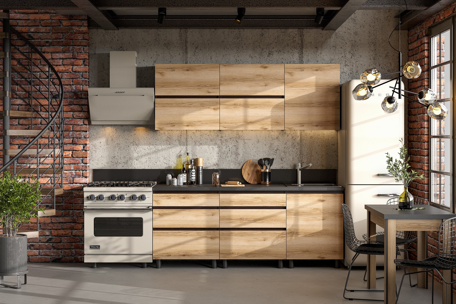 - Верхние модули со створками на газлифтах позволяют организовать грамотное хранение продуктов, кухонных принадлежностей и посуды.
