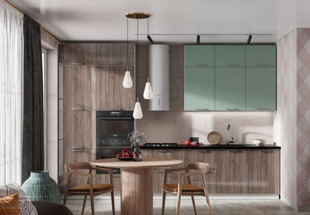 Суперматовые фасады теплых оттенков пленки ПВХ скомбинированы с трендовыми лаковыми фасадами спокойного древесного декора.