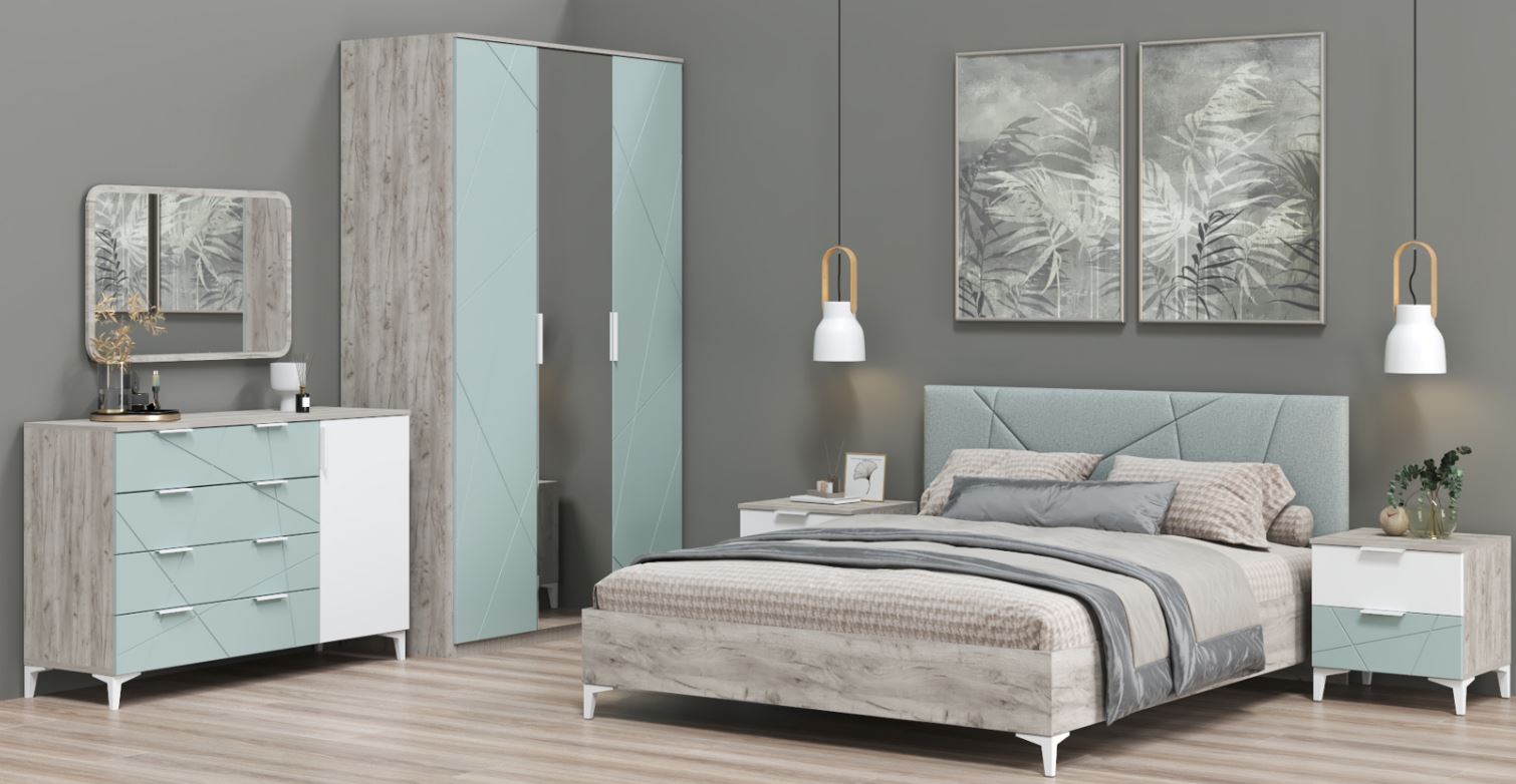 Ультрамодная коллекция мебели для спальни Лагуна выполнена в приятном сочетании нескольких оттенков: дуба серого с древесной текстурой, серо-голубого и белого снега софт. Такая палитра располагает к спокойствию и умиротворению, что является обязательным условием интерьера спальной комнаты.