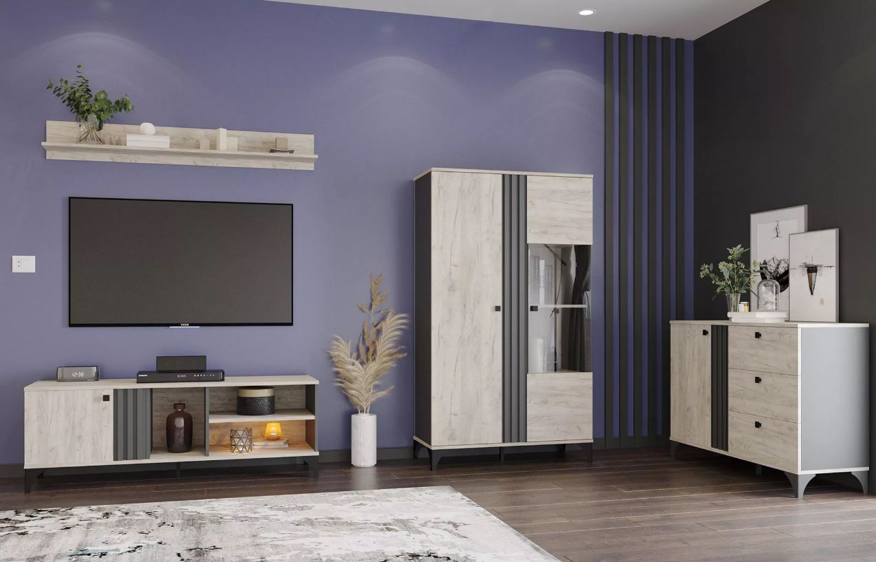Гостиная Отис предназначена для тех, кто ищет необычный дизайн в модной цветовой гамме дуба с контрастным антрацитом. Использование ламелей соответствует современным тенденциям и подчеркивает характер коллекции. Шкафы с реечными фасадами смотрятся не только лаконично и эффектно, но и по особенному изящно. Это слияние двух стилей - строгая геометрия форм придает сдержанности минимализма, а изящные 3D полосы добавляют классического благородства. Мебель с реечными фасадами уместна в стиле лофт, эко, скандинавский, минимализм.