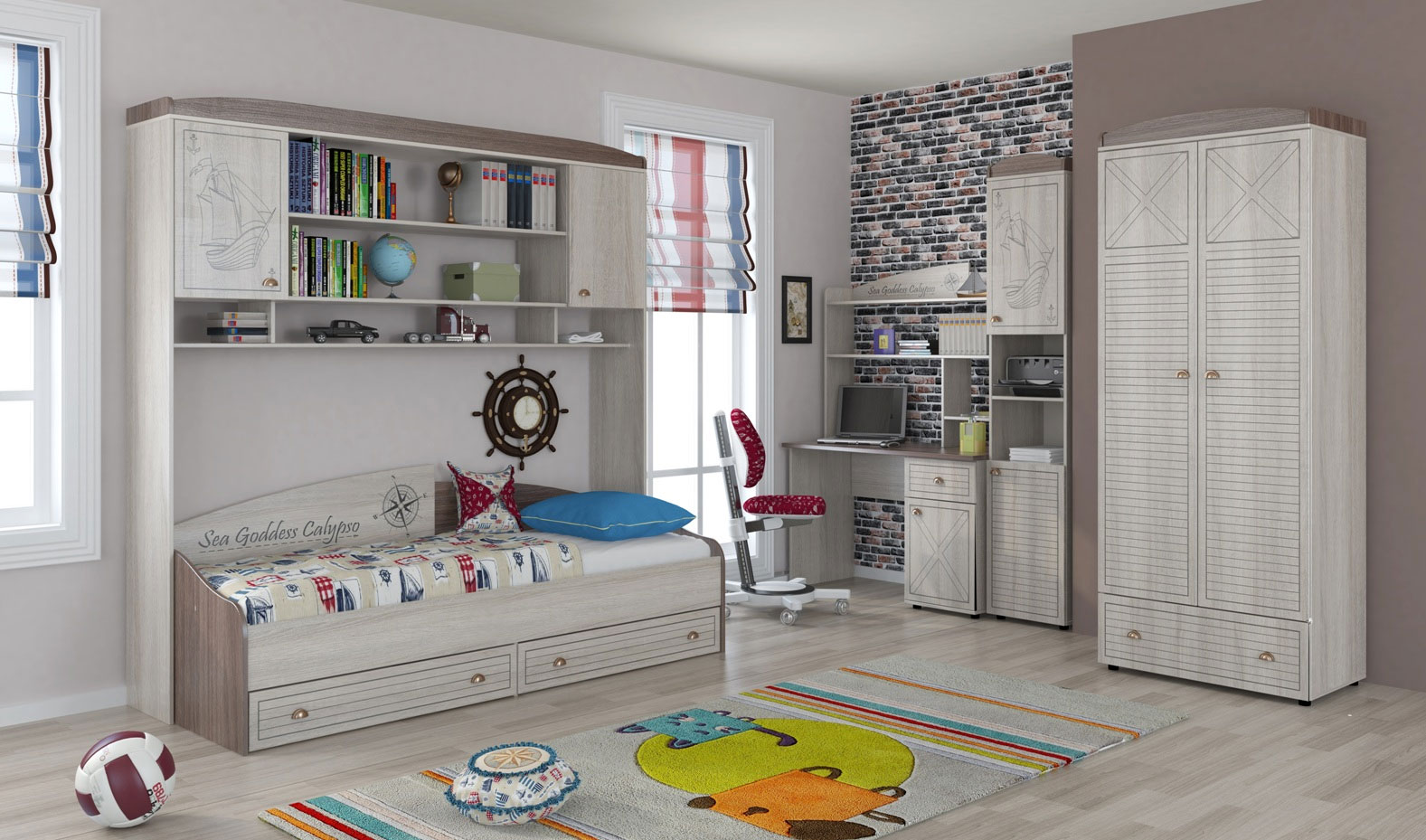 Набор мебели для детской "Калипсо" идеален для мальчиков, увлеченных морскими приключениями, старинными кораблями и пиратами. Стилем напоминает каюту корабля, на котором можно отправиться на поиски сокровищ. Набор мебели для детской "Калипсо" выполнен в сочетании двух цветов дуб Сантана светлый и темный, бронзовые ручки и украшения в морском стиле. Функциональные шкафы, полки, капитанский стол. Фасады украшены рисунками в морской тематике. Рисунок на фасады нанесен с применением современных технологий - лазерной обработки.