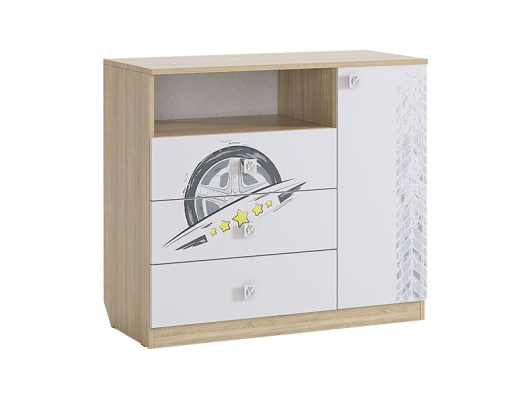 Комод Форсаж станет гармоничным дополнением интерьера любой комнаты. Три вместительных выдвижных ящика и полки, скрытые за распашной дверкой, пригодятся для аккуратного хранения сложенной одежды, постельного и нижнего белья, различных аксессуаров и косметики. Сверху на комоде можно разместить несколько ярких фотографий, вазу с цветами и оригинальные предметы декора.
