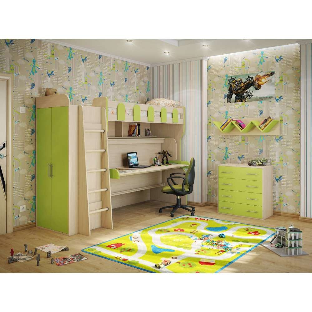 Детская Чудо настоящая находка для вас. Можно использовать для одного или двух детей. Кровать трансформируется в широкую письменную поверхность. В шкафу вы сможете расположить вещи и постельные принадлежности. Волка послужит забавным декором, а комод сохранит мелкие вещи в порядке.