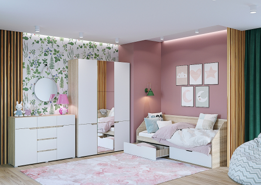 Детская Анталия (вариант 3) поможет обустроить достаточно уютную комнату для вашего ребенка Достаточно комфортное и широкое спальное место предоставит возможность расслабиться, отдохнуть и набраться сил после насыщенных дней, а два выдвижных ящика предназначены для хранения игрушек и постельного белья. Шкаф вместе с комодом предоставят достаточно места для хранения всего детского гардероба. Внутри шкафа находятся две штанги для вешалок-плечиков с красивыми платьями, деловыми костюмами и роскошной верхней одеждой. Множество полок созданы для бережного и аккуратного хранения одежды, нижнего белья, коробок с обувью и всевозможными аксессуарами. -