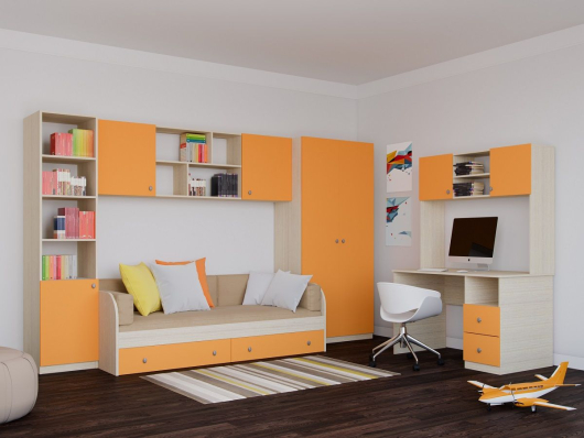 - шкаф 45 Астра - Ш900 х Г450 х В2000 мм.Детская Астра (вариант 1) станет настоящей находкой для заботливых родителей. Комплект мебели компактный и функциональный, ведь он имеет все необходимое для ребенка. Удобная предоставит достаточно удобное и комфортное спальное место, где ребенок сможет расслабиться, отдохнуть и набраться сил для новых свершений, а два вместительных выдвижных ящика созданы для аккуратного хранения разнообразных игрушек, постельного белья и пижамы. Полка навесная и стеллаж позволят разместить увлекательные и интересные книги, оригинальные сувениры и статуэтки, любимые игрушки, заслуженные грамоты и кубки, а также другие разнообразные предметы. Шкаф 2-х дверный имеет достаточно места для бережного хранения детского гардероба. Письменный стол вместе с надстройкой создают достаточно удобное место, где ребенок будет с удовольствием работать над домашними заданиями.