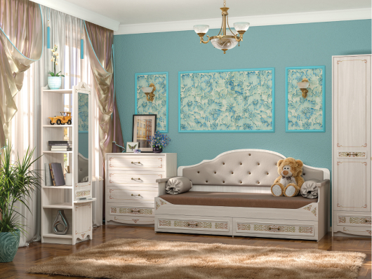 Детская Флоренция поможет со вкусом обустроить необычной уютную и стильную комнату для ребенка. Стеллаж предоставит дополнительное место для размещения интересных книг, семейных фотографий, необычных статуэток, оригинальных декоративных предметов и многого другого. Зеркало придаст уверенности и поднимет настроение. Кровать с достаточно удобным спальным местом предоставит возможность ребенку отдохнуть и набраться сил после трудных и насыщенных дней. Кровать имеет два вместительных выдвижных ящика, созданных для хранения постельного белья. Шкаф вместе с комодом помогут разместить весь гардероб вашего ребенка. За распашными дверьми находится выдвижная штанга для вешалок-плечиков с безупречно выглаженной одеждой. Полки и один выдвижной ящик предназначены для хранения другой одежды, постельного и нижнего белья, различных аксессуаров и коробок с обувью.