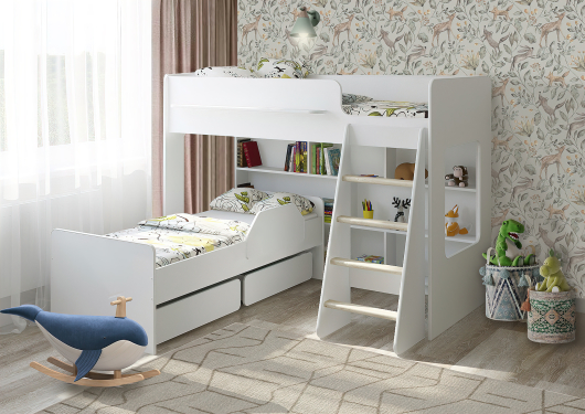 Детская Буратино 2 отличное решение для детской комнаты для двоих детей. Обратите внимание на безопасную лестницу, по ней ребёнок сможет подниматься спать без угрозы упасть. Нижняя кровать с 2-мя ящиками, где можно хранить постельные принадлежности с игрушками. Верхняя кровать имеет удобный бортик безопасности. -