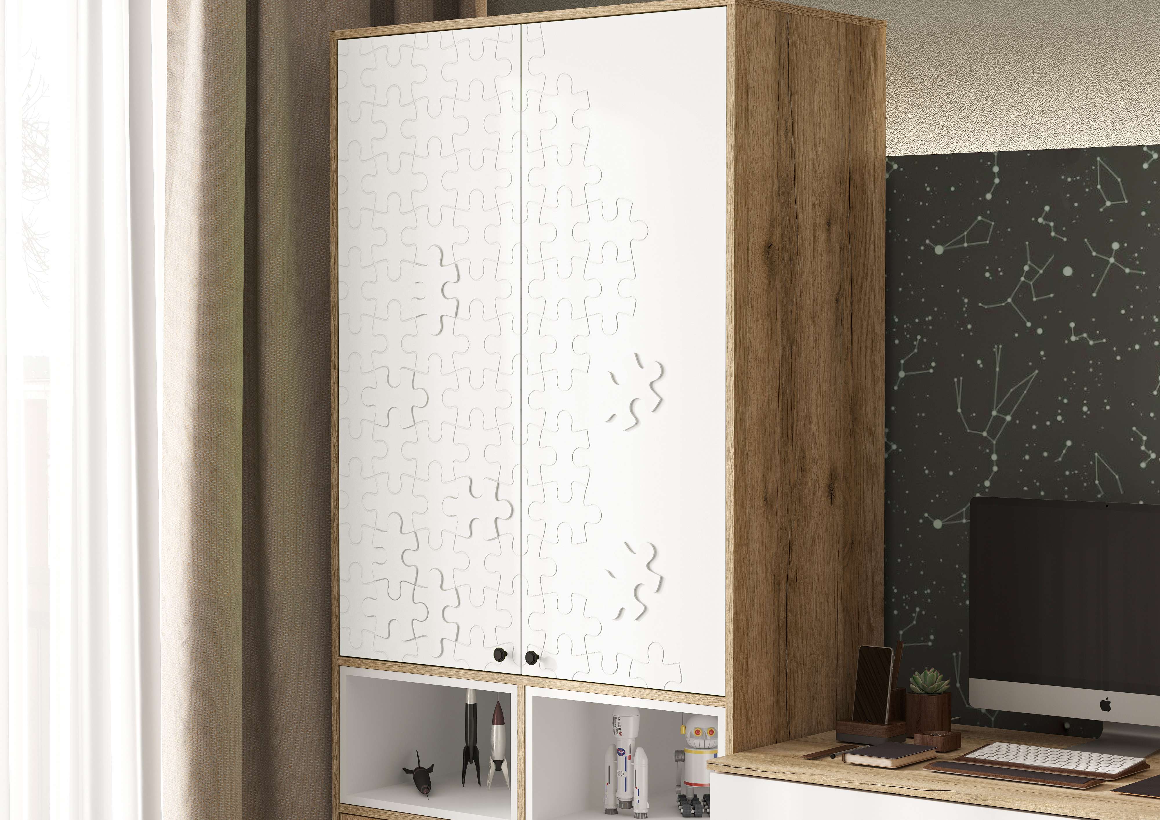 Модульная детская Киви прекрасное решение для организации детской комнаты. Универсальный дизайн подойдёт мальчику и девочке. Разнообразие элементов, позволит собрать комплект, наиболее подходящий под вашу комнату. -