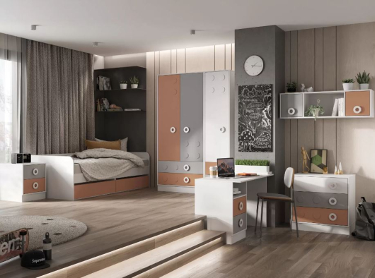 Детская мебель Турбо стильная модель для детской комнаты. Фасады выполнены в стиле лего, что обязательно понравится ребёнку. Благодаря универсальной расцветке, подойдёт в комнату мальчику и девочке.