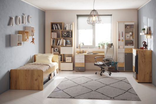 - полка навесная Лойс 89 - Ш688 х Г212 х В250 мм.Детская Лойс (вариант 1) поможет обустроить комфортную и необычайно уютную комнату для вашего ребенка. Под спальным местом находится большой выдвижной ящик, который пригодится как место для хранения постельного белья или как дополнительное спальное место для незапланированных гостей. Кроватный ящик открывается за ручку-карман, который карман дает возможность аккуратно сложить необходимые перед сном вещи: книгу, телефон, любимую игрушку. Стеллаж-трансформер можно раздвинуть на необходимую ширину в пределах от 560 мм до 989 мм, таким образом занимая отведенное для него место в детской с точностью до миллиметра. Письменный стол поможет создать достаточно комфортное рабочее место. Выдвижные ящики созданы для хранения всех необходимых школьных и канцелярских принадлежностей. Под откидной частью стола, которая открывается за плавный вырез, прячется ниша для хранения и отверстие с заглушкой для вывода проводов. Также нишу можно использовать и для размещения органайзеров с карандашами, фломастерами и красками, чтобы они не отвлекали от творчества. Шкаф МЦН Лойс 85 имеет две зоны хранения: внутренняя закрытая зона и фасадная часть с карманами. Внутри шкафа находятся полки с ограничителями и ниша с крючками, где можно хранить форму для тренировок, мячи, ролики, наборы для творчества и другие аксессуары для хобби. Зона хранения на самом фасаде включает в себя: карман для высоких бумаг и ватманов, ручку, выполненную виде полочки, и два крючка, на которые удобно повесить заработанные медали, скакалки, элементы декора. Комод оснащен пятью выдвижными ящиками и стационарной штангой в нише без фасадов для хранения школьной формы или домашней одежды. Теперь ваш ребенок сможет самостоятельно повесить школьную форму и кофточку. Мебель Лойс в стиле урбан создана для активных, энергичных ребят.