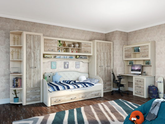 - надставка на стол Мартина - Ш1240 х Г325 x В1328 мм.Детская Мартина (вариант 1) поможет обустроить достаточно уютную комнату для проживания вашего ребенка. На открытых полках будут гармонично смотреться семейные фотографии, любимые детские игрушки, интересные книги, небольшие вазоны с цветами, памятные сувениры, необычные статуэтки и оригинальные предметы декора. Стол вместе с надстройкой помогут создать и обустроить необычайно комфортное место, где ребенок будет с удовольствием выполнять домашние задания и заниматься саморазвитием. Широкая столешница позволит расположить все необходимое под рукой и при этом спокойно делать записи или читать книгу. Выдвижные ящики предназначены для размещения разнообразных канцелярских и школьных принадлежностей. Кровать предоставит необычайно удобное спальное место, где вы после трудных и насыщенных дней сможете расслабиться, отдохнуть и набраться сил. За распашными дверьми шкафа и пенала находятся штанги для вешалок-плечиков, а полки и выдвижные ящики пригодятся для размещения сложенной одежды, постельного и нижнего белья, различных аксессуаров и коробок с обувью. Мебель Мартина отличается сочетанием светлых оттенков, изысканной фурнитурой, древесным декором фасадов, которое создаст неповторимую эстетику в вашем доме.