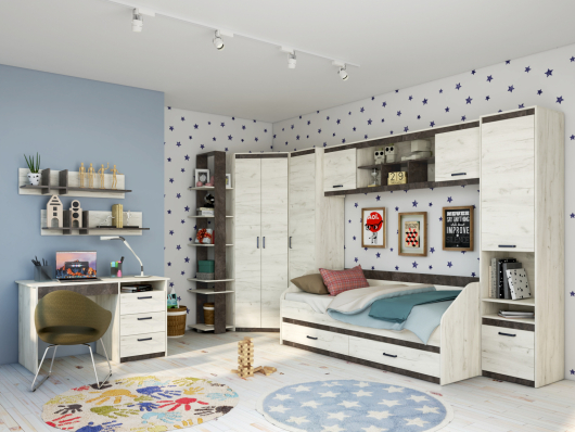 - пенал полуоткрытый Прага - Ш484 х Г440 х В2150 мм.Детская Прага (вариант 3) поможет обустроить достаточно уютную комнату для проживания вашего ребенка. Кровать предоставит необычайно удобное спальное место, где вы после трудных и насыщенных дней сможете расслабиться, отдохнуть и набраться сил. Два вместительных выдвижных ящика пригодятся для размещения детских игрушек и постельного белья. Стол поможет создать и обустроить необычайно комфортное место для работы или учебы. Широкая столешница позволит расположить все необходимое под рукой и при этом спокойно делать записи или читать книгу. Выдвижной ящик и тумба с дверцей предназначены для размещения разнообразных канцелярских и прочих принадлежностей. За распашными дверьми углового шкафа и пенала находятся штанги для вешалок-плечиков. Полки пригодятся для размещения сложенной одежды, постельного и нижнего белья, различных аксессуаров и коробок с обувью. Мебель Прага актуальна и универсальна благодаря прямым и строгим линиям, трендовому дизайну модулей.