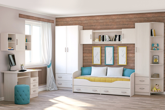 - стол письменный Колибри Диал - Ш1100 х Г600 х В750 мм.Молодежная Колибри (вариант 2) поможет обустроить достаточно уютную комнату для проживания вашего ребенка. Кровать предоставит необычайно удобное спальное место, где после трудных и насыщенных дней можно расслабиться, отдохнуть и набраться сил. За распашными дверьми 2-х створчатого шкафа находится штанга для вешалок-плечиков с одеждой, а выдвижные ящики и полки в пенале пригодятся для бережного хранения сложенной одежды, различных аксессуаров и коробок с обувью. На открытых полках найдется достаточно места для размещения семейных фотографии, интересных книг, любимых игрушек, необычных статуэток и оригинальных предметов декора. Широкая столешница письменного стола позволит расположить все необходимое под рукой и при этом спокойно делать записи или читать книгу. Открытые ниши и три выдвижных ящика предназначены для размещения разнообразных канцелярских и прочих принадлежностей.