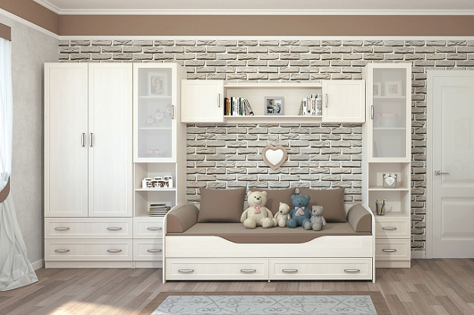 Молодежная Колибри (вариант 1) поможет обустроить достаточно уютную комнату для проживания вашего ребенка. Кровать предоставит необычайно удобное спальное место, где после трудных и насыщенных дней можно расслабиться, отдохнуть и набраться сил. За распашными дверьми 2-х створчатого шкафа находится штанга для вешалок-плечиков с одеждой, а антресольные полки и два выдвижных ящика пригодятся для бережного хранения сложенной одежды, различных аксессуаров и коробок с обувью. На открытых полках найдется достаточно места для размещения семейных фотографии, интересных книг, любимых игрушек, необычных статуэток и оригинальных предметов декора.