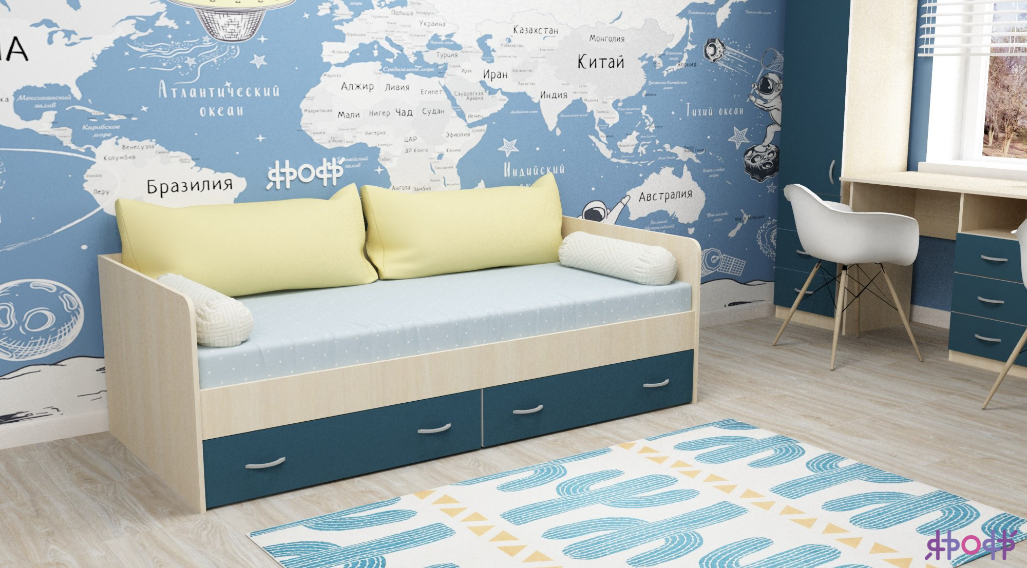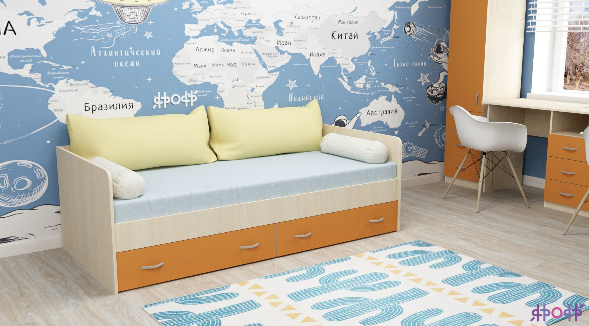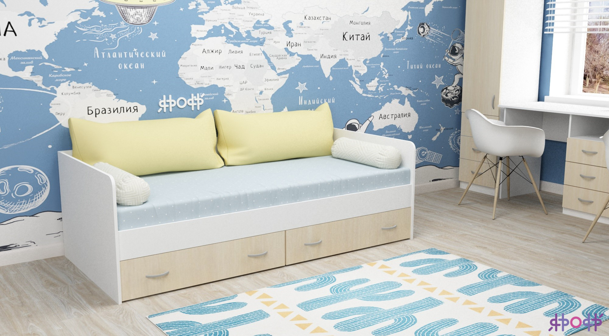 Кровать с выкатными ящиками Ярофф стильная и современная. Изготовлена из высококачественных материалов. Имеет полноценное спальное место, будет служить ребёнку долгие годы. На такую кровать с комфортом ляжет и взрослый, когда будет укладывать ребёнка. Кровать с выкатными ящиками Ярофф имеет место для игрушек и основание под матрас. -