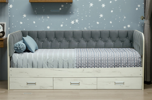 Софа №14.1 стильная и современная детская кровать. Функциональность кровати добавляют выдвижные ящики. Мягкая спинка обеспечит комфорт ребёнку. -