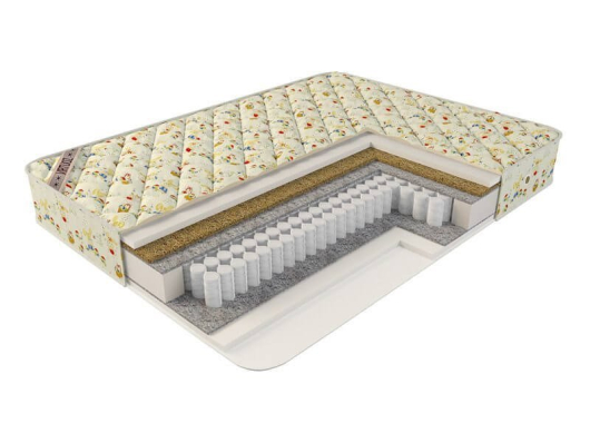 Детский матрас Добрый основан на независимом пружинном блоке. 256 пружин на 1 кв. метр. С одной стороны расположен 2 см слой Холлофайбера, со второй - 2 см слой Холлофайбера и 1 см слой кокосовой койры. В качестве изолируемого материала используется Термовойлок. Матрас изготовлен с чехлом из поликатона с детским рисунком.
