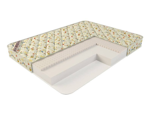 Беспружинный детский матрас Нежный выполнен на основе плиты из материала натуралформ. С одной стороны 2 см слой натурального латекса. Матрас отлично выдерживает нагрузки до 80 кг на спальное место. Чехол изготовлен из приятного на ощупь поликоттона с цветным рисунком.