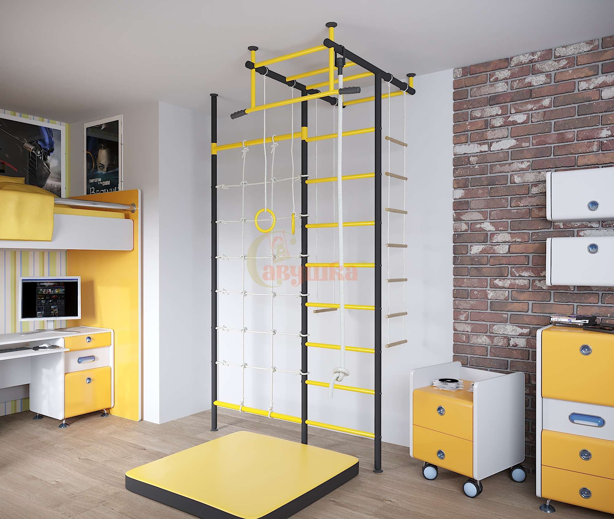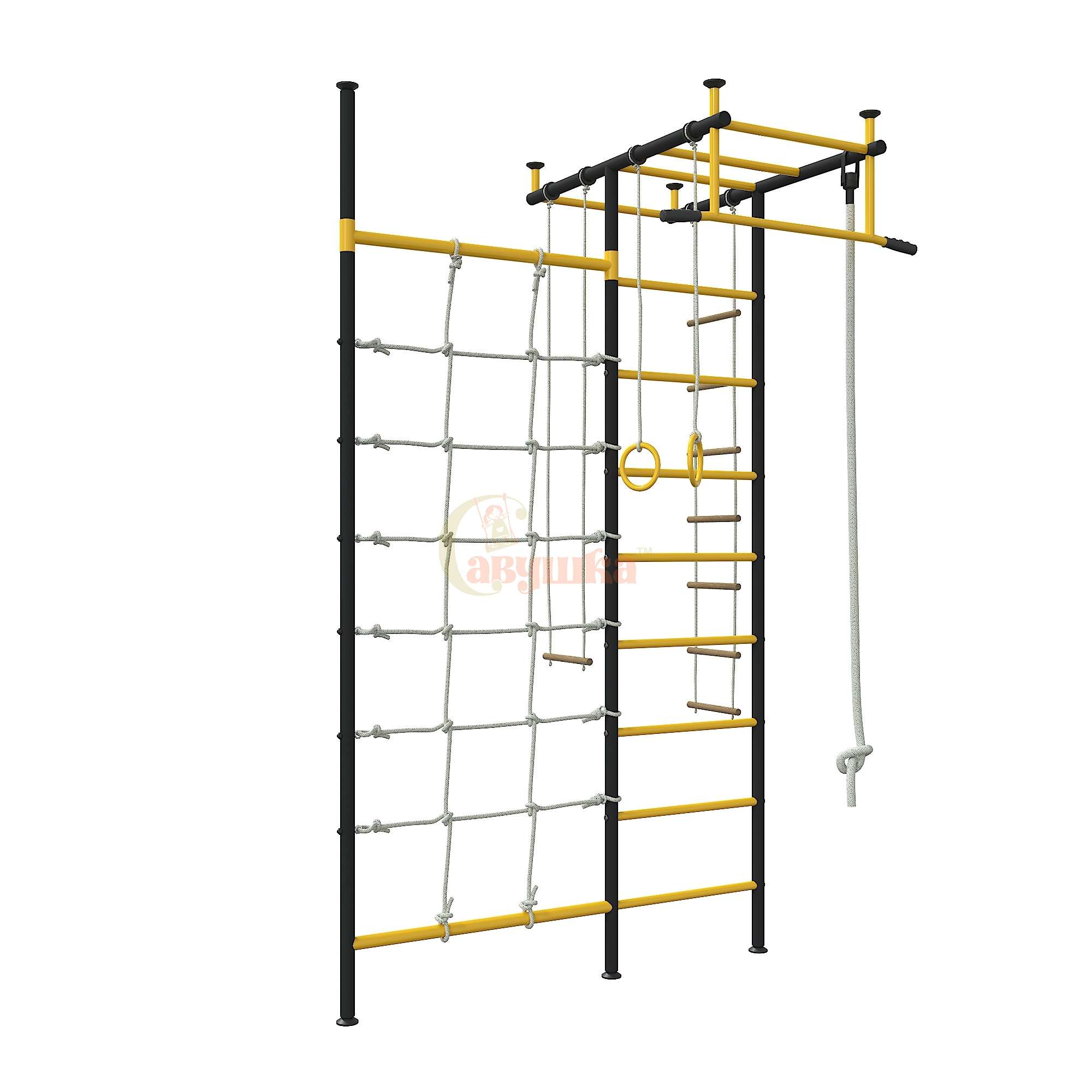 Комплектация: канат, кольца гимнастические, лестница веревочная, рукоход, сетка-лазалка, трапеция, турник металлический, шведская стенка.