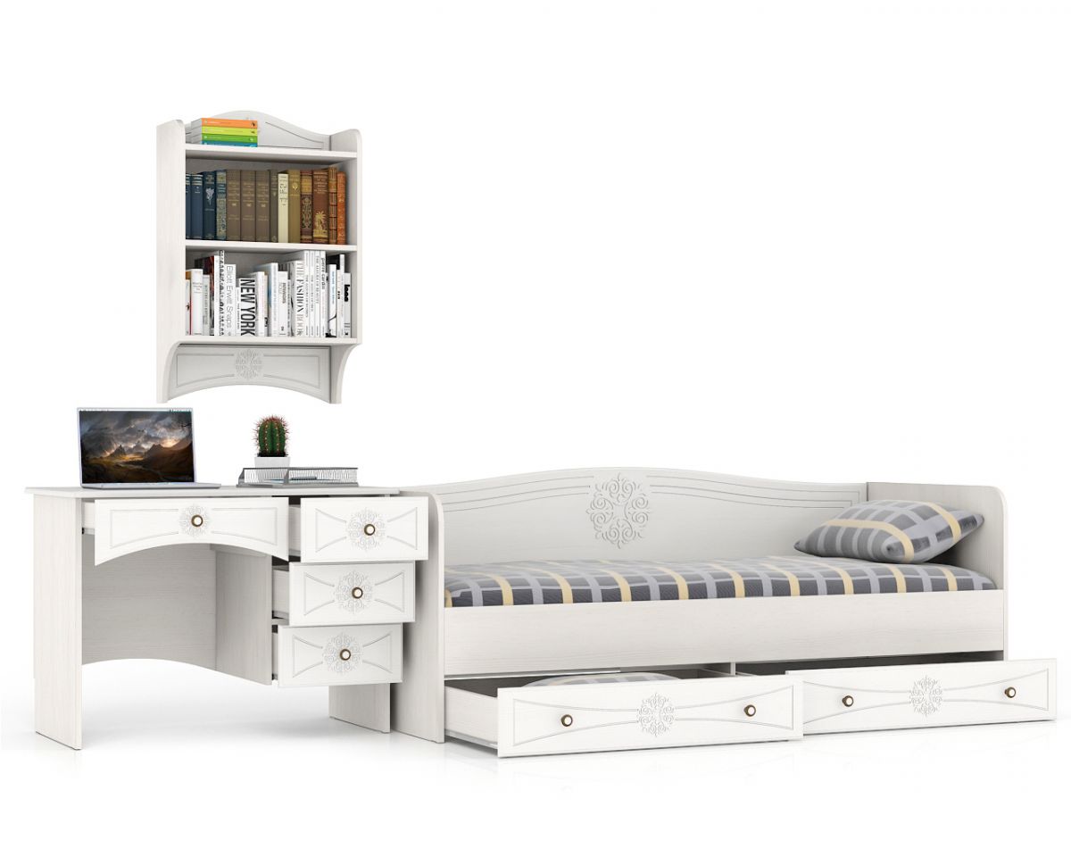 - кровать 800 с ящиками Онега КР-800 - Ш2040 х Г840 х В800 мм.Детская Онега компоновка 01 идеально подойдет для интерьера детской комнаты. На открытых полках можно разместить интересные книги, оригинальные сувениры и любимые игрушки. Стол поможет создать достаточно удобное рабочее место. Широкая столешница позволит разместить большое количество необходимые предметов и спокойно работать над домашними заданиями. Четыре выдвижных ящика предоставят достаточно места для размещения всех необходимых принадлежностей. Достаточно комфортное спальное место поможет расслабиться после трудных дней, отдохнуть и набраться сил. Два вместительных выдвижных ящика пригодятся для хранения постельного белья и игрушек.