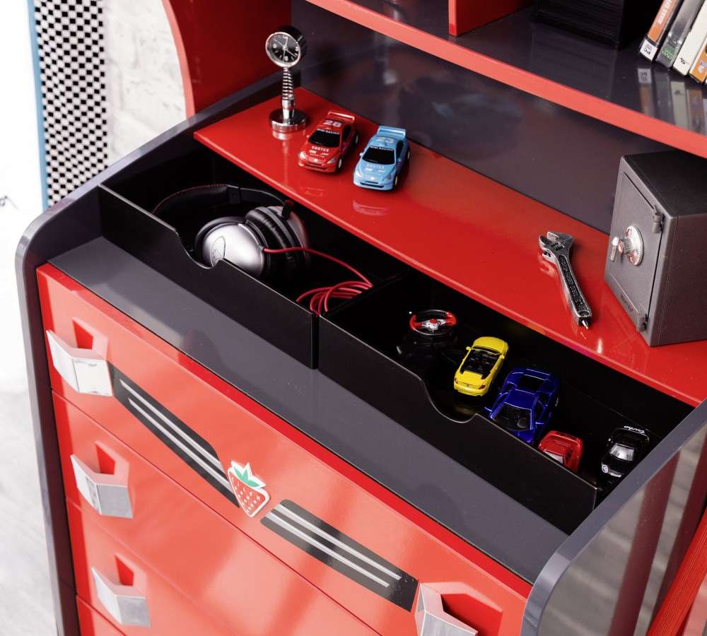 Комод-бензоколонка Champion Racer 20.35.1201.00 станет отличным дополнение уютного интерьера яркой детской комнаты. Изделие оснащено четырьмя вместительными выдвижными ящиками, созданными для хранения одежды и белья. Верхний ящик представляет собой практичный органайзер для удобного размещения игрушек, белья, аксессуаров и мелких деталей. В надстройке имеются дополнительные полки и «секретная» закрытая секция. На открытых полках можно разместить детские фотографии и его первые награды. Креативное оформление мебели Champion Racer превратит детское пространство в увлекательный гоночный трек, где ребенок сможет полноценно развиваться и расти творческой, открытой миру, личностью.