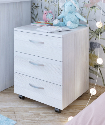 Тумбочка имеет три вместительных выдвижных ящика, прочный каркас и качественные направляющие гарантируют длительный и комфортный период ее эксплуатации. Тумбочка помогает организовать пространство, поддерживать порядок в комнате, ведь в нее можно сложить все нужные вещи, начиная от канцелярии заканчивая бельем, мелкими предметами одежды, игрушками.