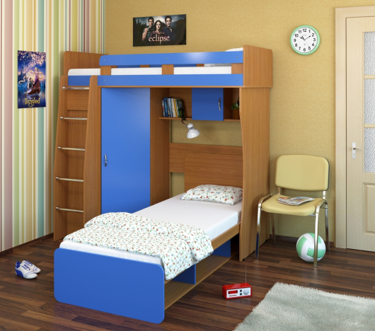 Двухъярусная кровать "Карлсон М3». Детский мебельный комплекс, объединивший в себе два спальных места, расположенных перпендикулярно на разных уровнях, с вместительным встроенным угловым шкафом. Верхняя кровать размером 1860х70 см подойдет как маленькому ребенку, так и подростку. Размер нижней – 200х80 см, то есть достаточный даже для взрослого человека. Расположенная с фасада лестница из пяти металлических ступеней – трубок обеспечивает удобный подъем на второй ярус комплекса, развивает моторику и координацию движений ребенка. Под нижней кроватью расположены ниши, а над ней - удобная антресоль, что позволяет эффективно использовать полезное пространство двухъярусной кровати "Карлсон-3".