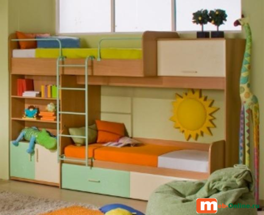 Комплектация: вверху справа секция с откидной дверцей на газовых подъемниках. Слева потайной шкаф с распашной секцией на трёх ножках-роликах, внизу за распашными дверцами секция с горизонтальной полкой, внутри шкафа горизонтальная штанга для одежды В основании нижней кровати два выдвижных ящика с полновыкатным механизмом.