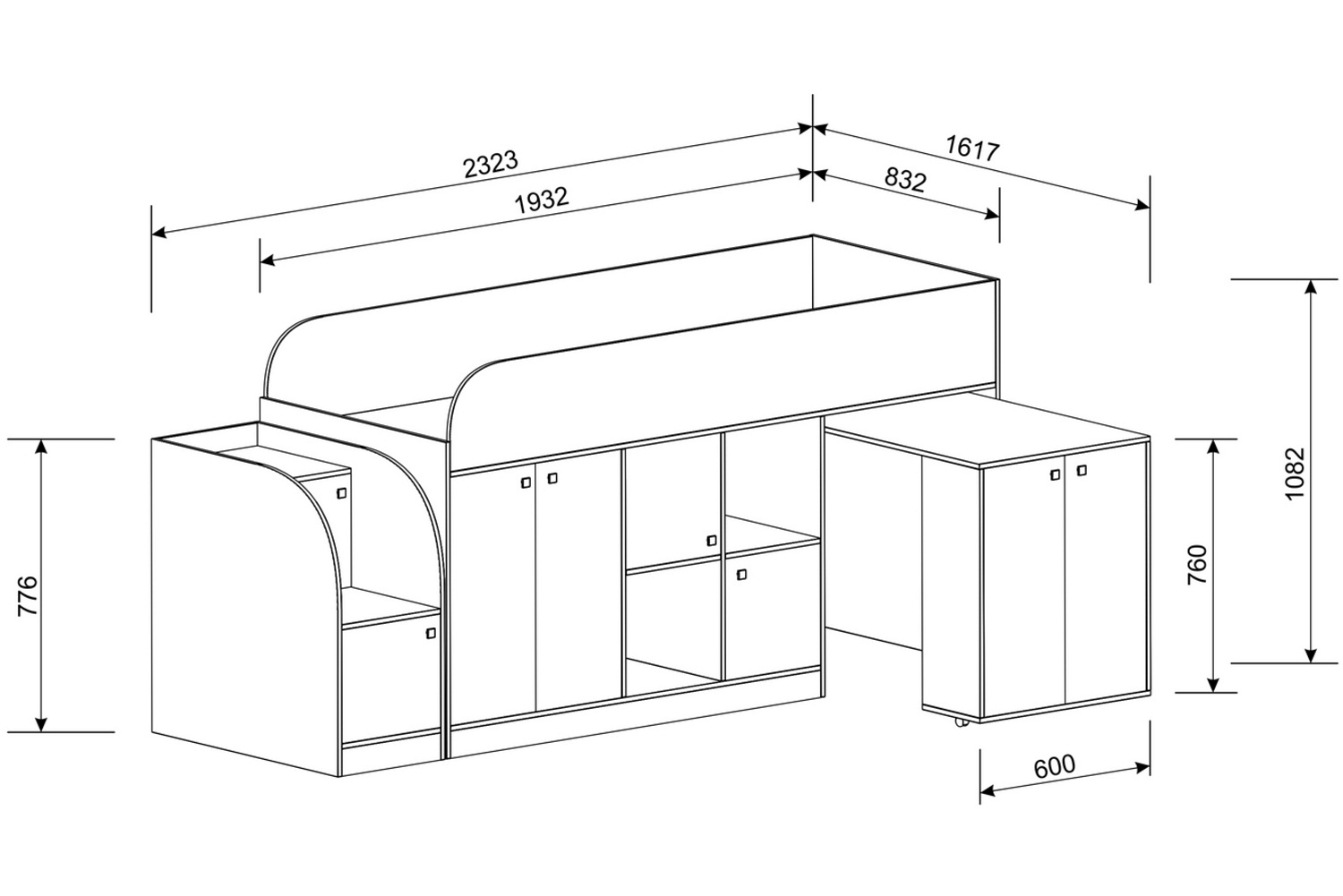 Ширина, мм 832 Глубина, мм 2323 Высота, мм 1082 ?Спальное местоШирина х Длина в мм800х1900 ?МатериалМатериал изготовленияЛДСП, МДФ Производитель Вариантов исполнения 1 -
