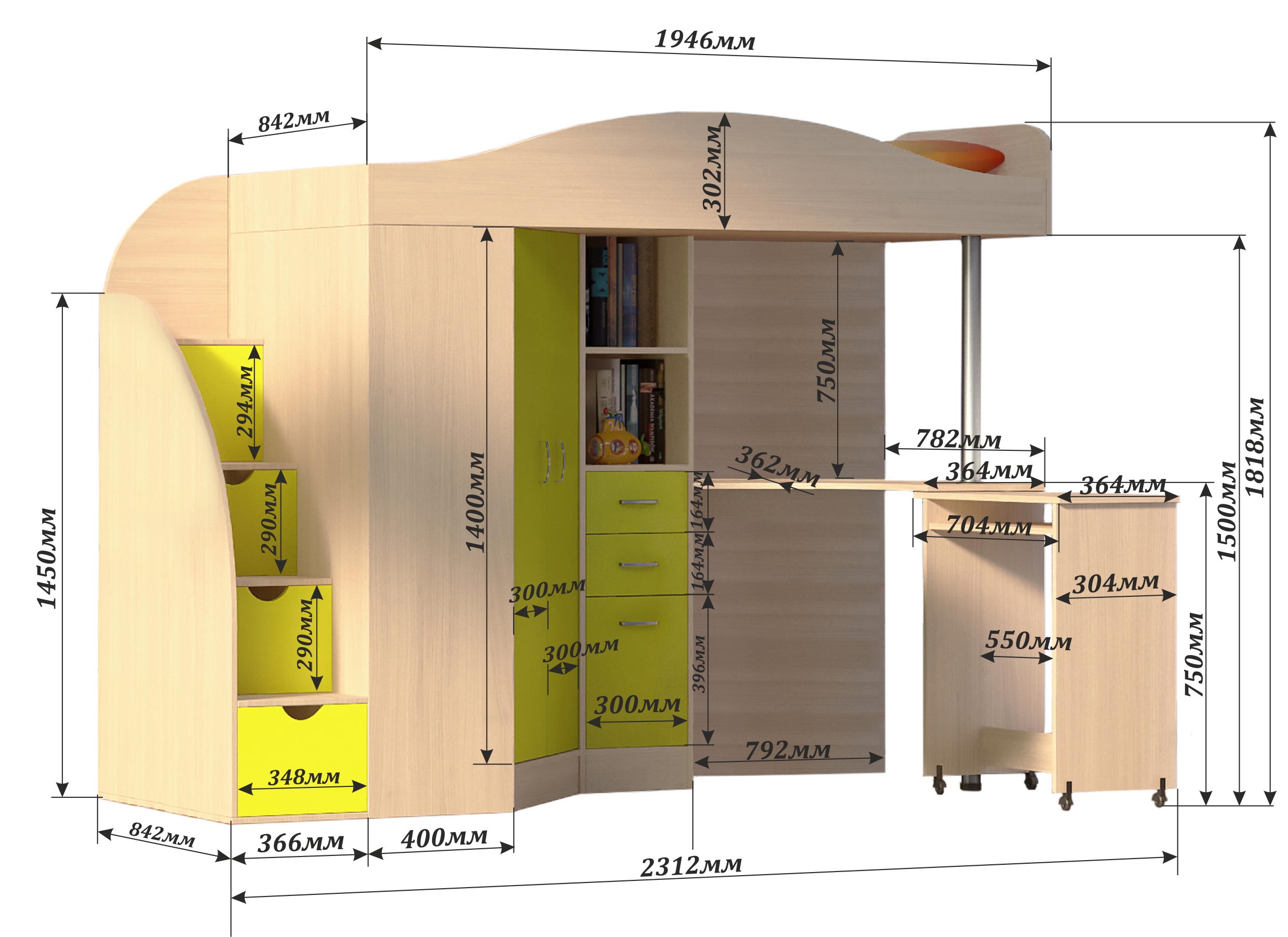 Ширина, мм 1410 Глубина, мм 2310 Высота, мм 1800 ?Спальное местоШирина х Длина в мм800х1900 ?МатериалМатериал изготовленияЛДСП Производитель Вариантов исполнения 1 -