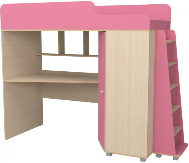 Кровать чердак с рабочей зоной Р440 Капризун 5 станет настоящей находкой для заботливых родителей. Комплект мебели компактный и функциональный, ведь он имеет все необходимое для ребенка: просторное и комфортное спальное место, лестницу для безопасного подъема и спуска, вместительный шкаф со штангой и полками внутри для хранения детской одежды, стол с полками для выполнения домашних заданий.