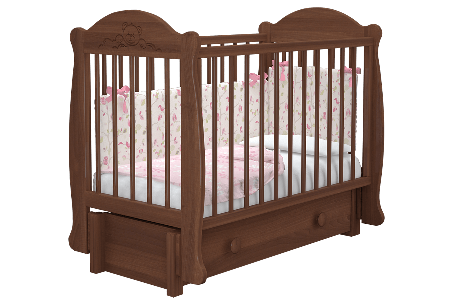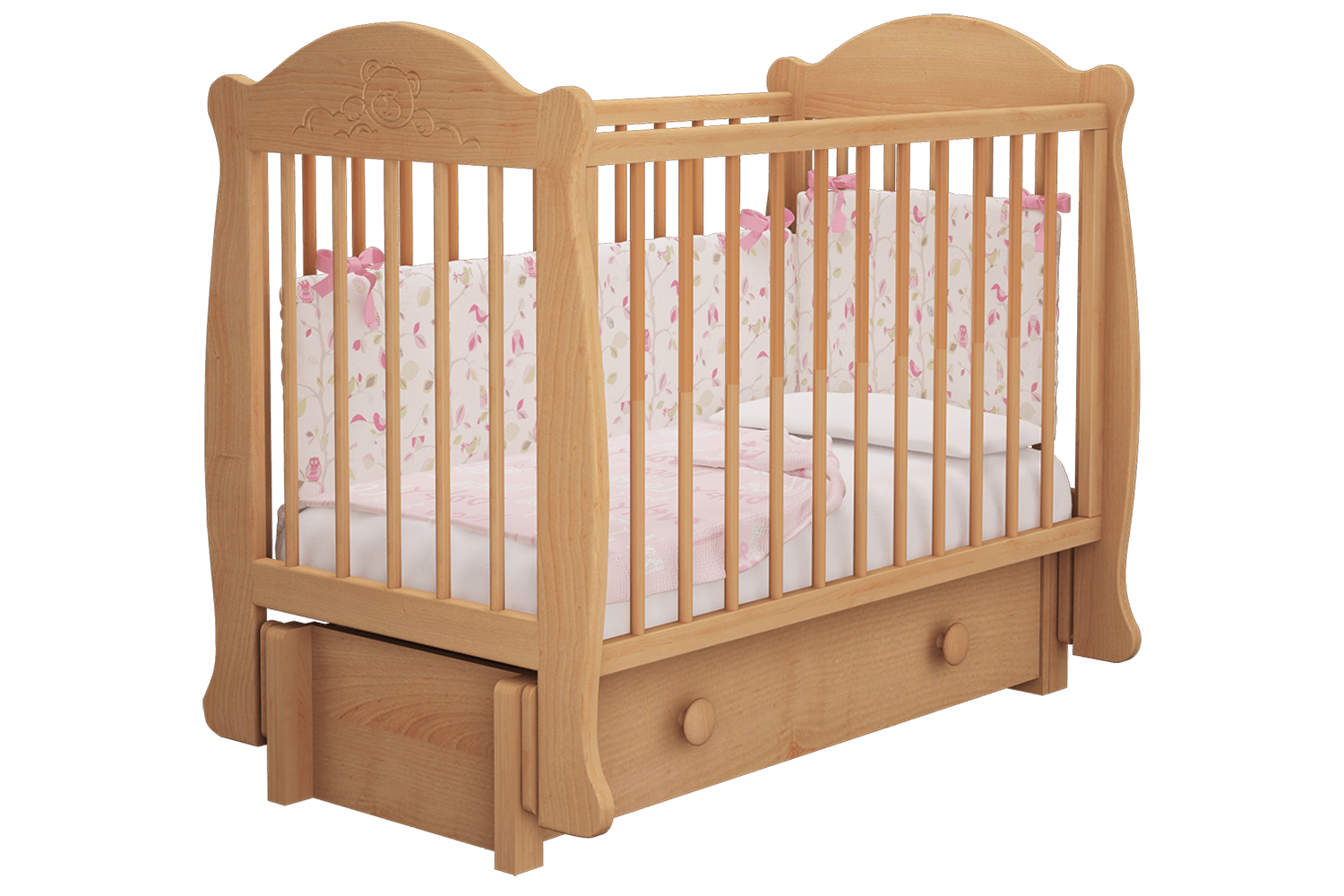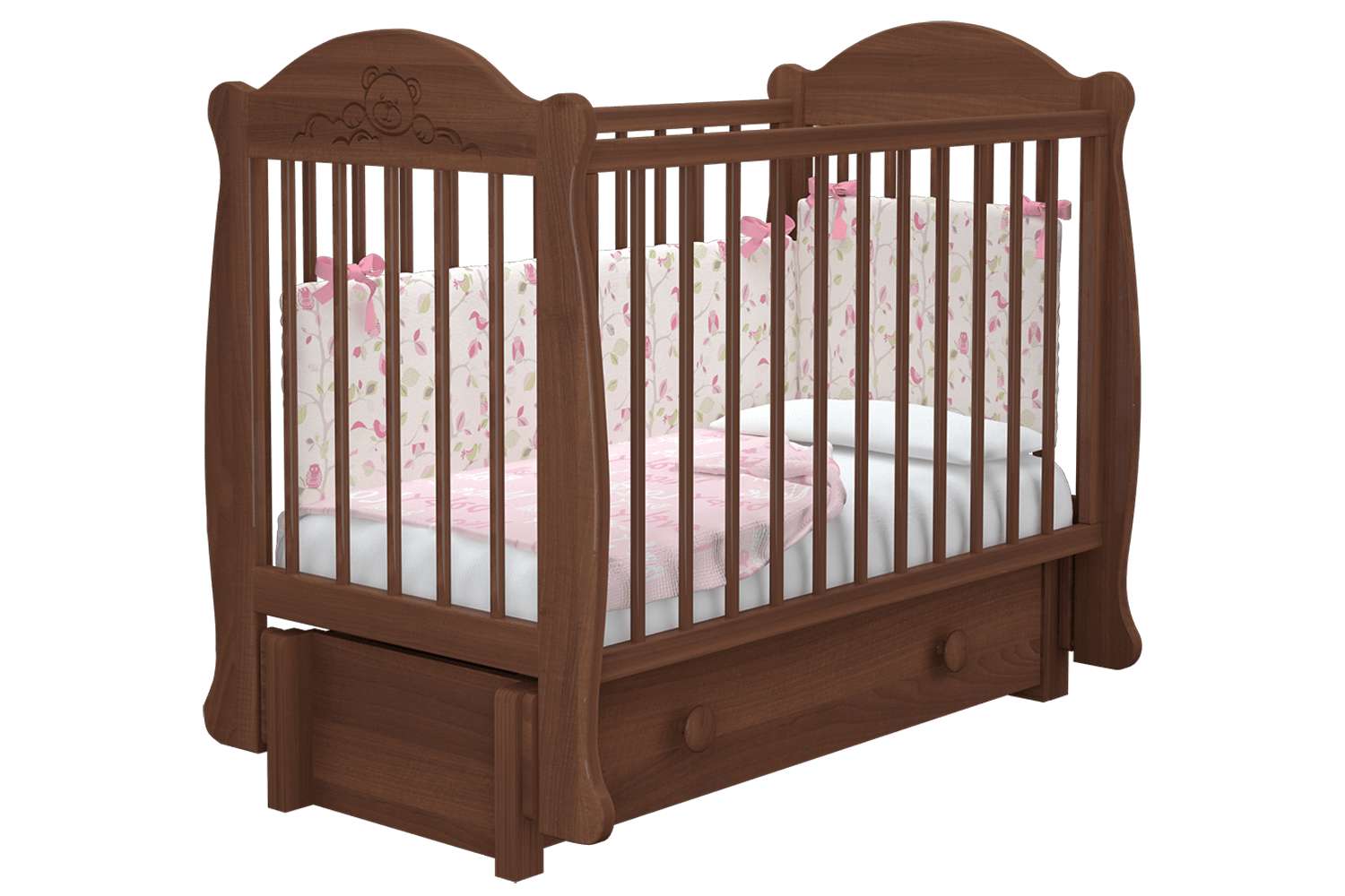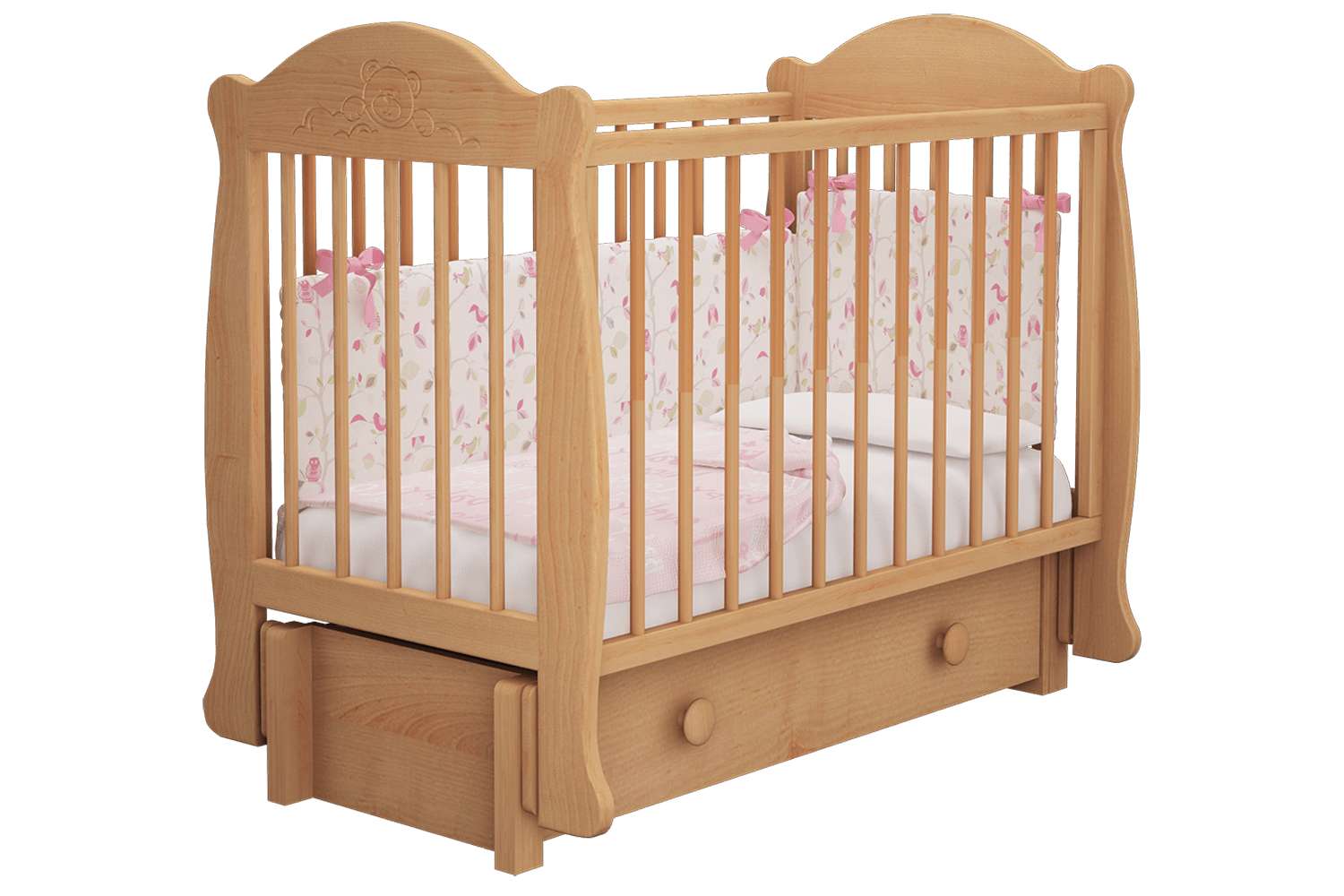 Кроватка детская Мишутка 3 станет отличным дополнением интерьера уютной детской комнаты. Изделие предоставит достаточно комфортное спальное место для новорожденного малыша. Особенностью кровати является наличие маятникового механизма универсального качания, который может быть собран либо для продольного, либо для поперечного качания. Также возможно снять ограждение, а при необходимости установить его на необходимую высоту. Вместительный выдвижной ящик пригодится для хранения детской одежды, пеленок, постельного белья или первых игрушек.