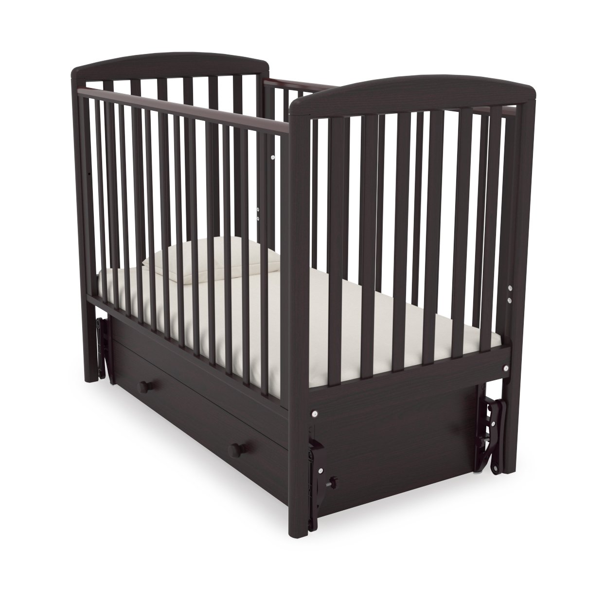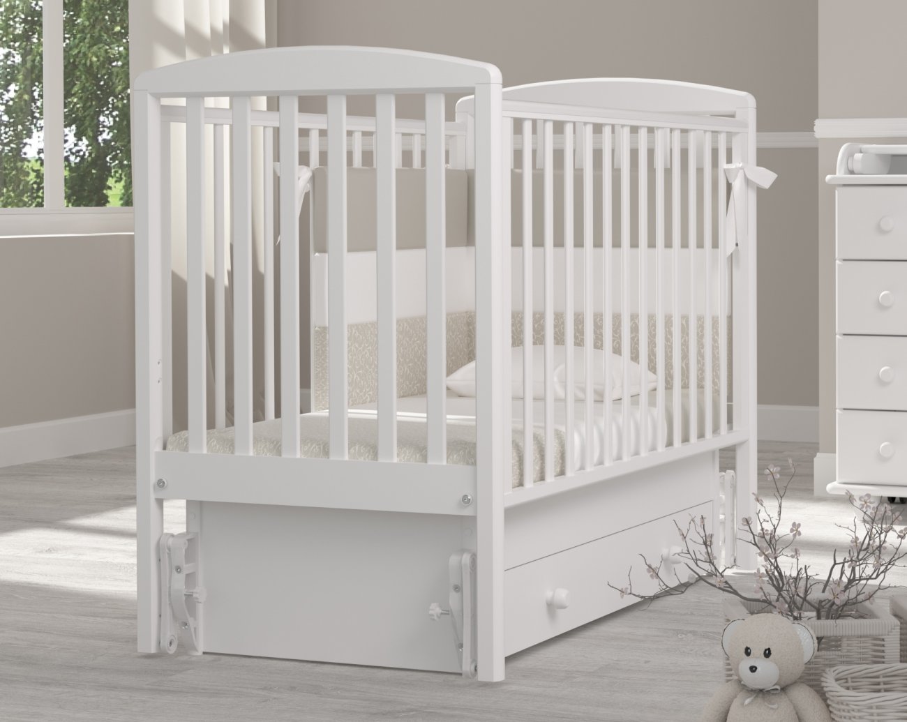 - Передняя стенка кроватки имеет способность опускаться, облегчая родителям контакт с младенцем.