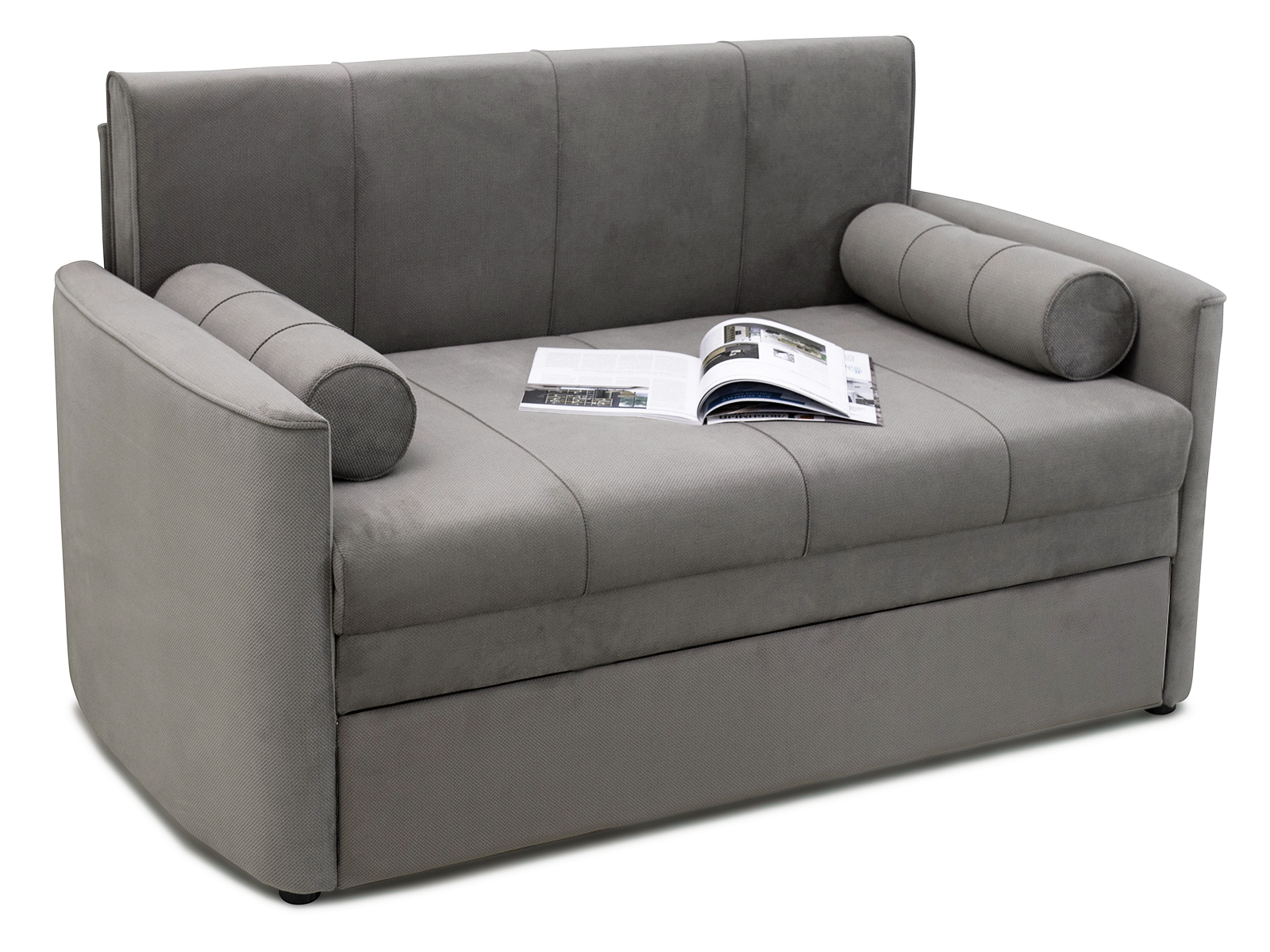 Диван-кровать Мелани Р (120) - компактный современный диванчик. Скругленные подлокотники с кантами подчеркивают эргономичность модели. Простой и надежный механизм трансформации на каждый день обеспечит удобным спальным местом ребенка или подростка. Может использоваться в качестве гостевого спального места для взрослого. Размер сп. места 195 х 120 см, есть небольшой бельевой ящик. Диван выполнен в мягком фактурном велюре. "Пальчиковый эффект" на ткани обивки выражен средне. Опоры - цвет черный, круглые, высота 25 мм., выполнены из высококачественного пластика. Прочность конструкции ножек обеспечена ребрами жесткости и внутренним креплением под фурнитуру.