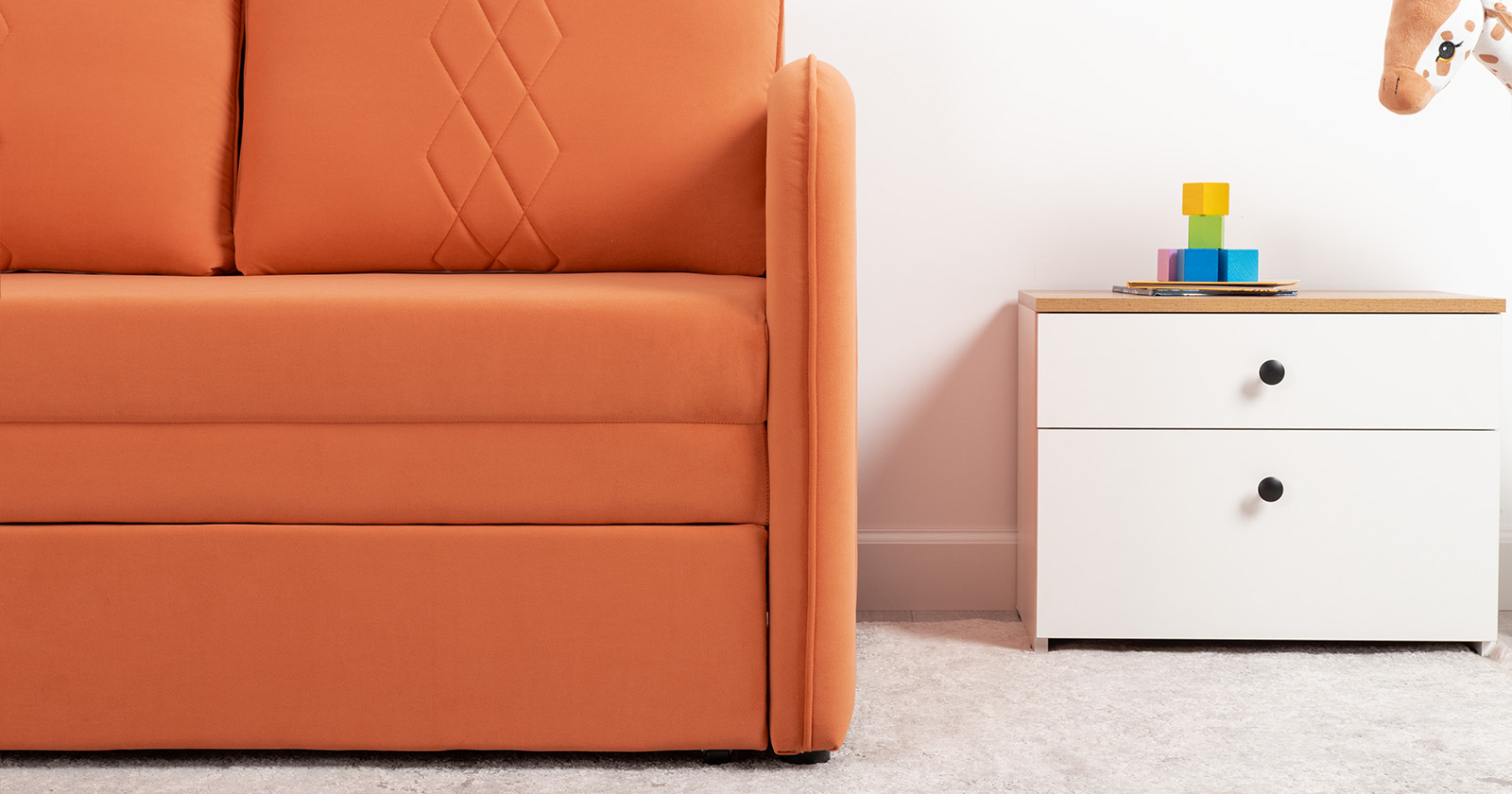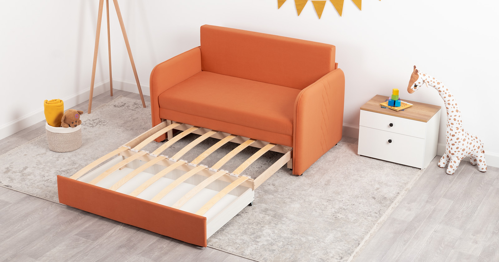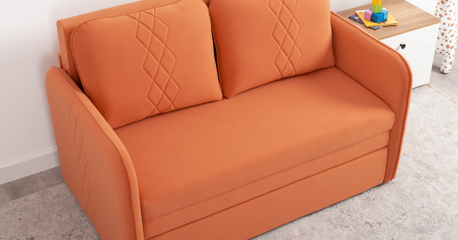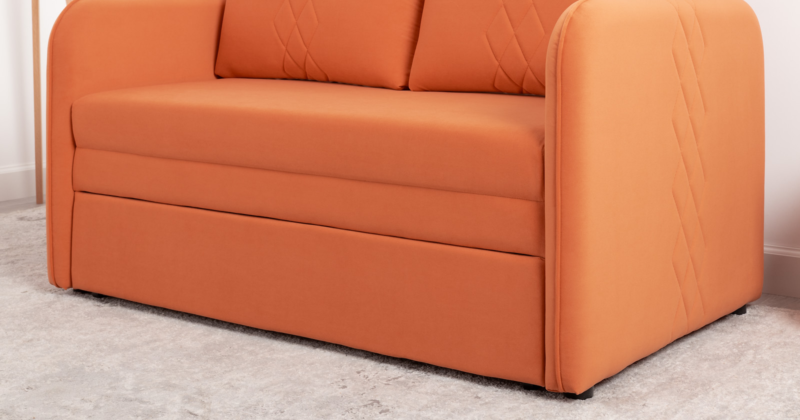 Стильный диван Юта для детской и гостиной. Трансформируется в полноценное спальное место для детей и подростков. Лаконичный дизайн в виде декоративной отстрочки подчеркивает фактуру велюра, а небольшие размеры позволят разместить его в любом пространстве.