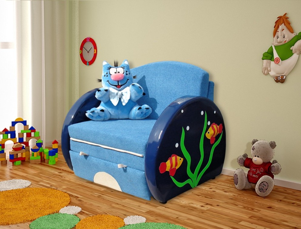 Детский диван Царапыч идеально впишется в любой интерьер детской комнаты. Даная модель выполнена в виде удобного кресла с нарисованными рыбками по бокам, что обязательно порадует вашего ребенка. При помощи нескольких движений, небольшой диванчик трансформируется в полноценную детскую кровать. Такой диван поразит вас и ваших детей своей функциональностью, практичностью и ярким дизайном.