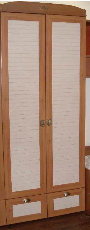 Комплектация: за распашными дверями верхняя и нижняя полки и горизонтальная штанга для одежды. Внизу два выдвижных ящика. -