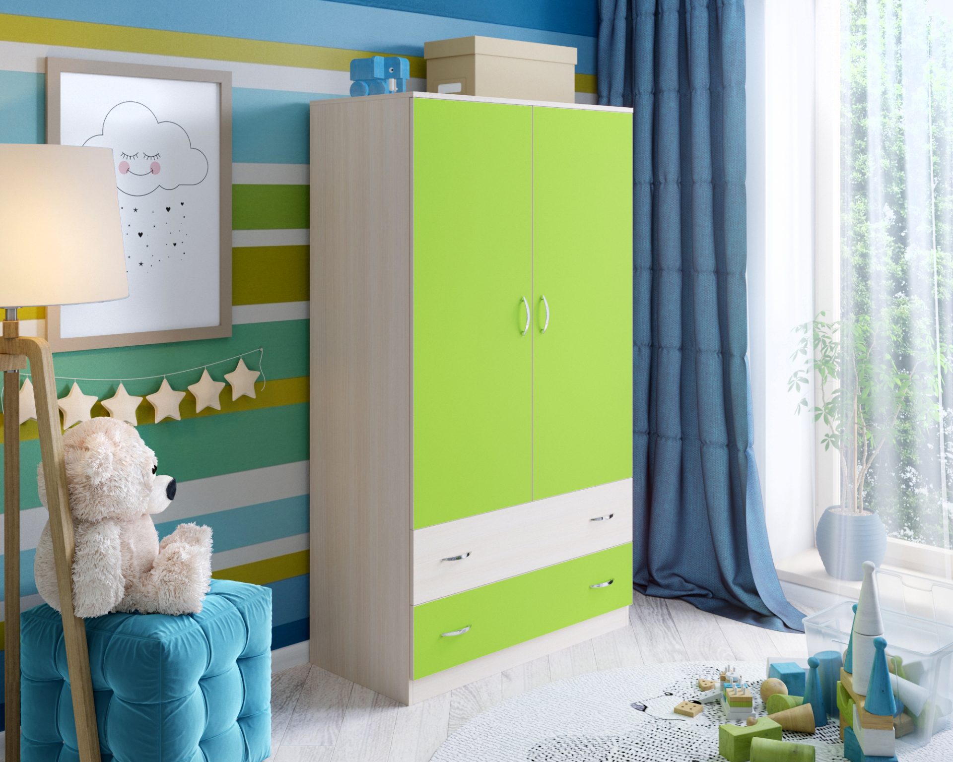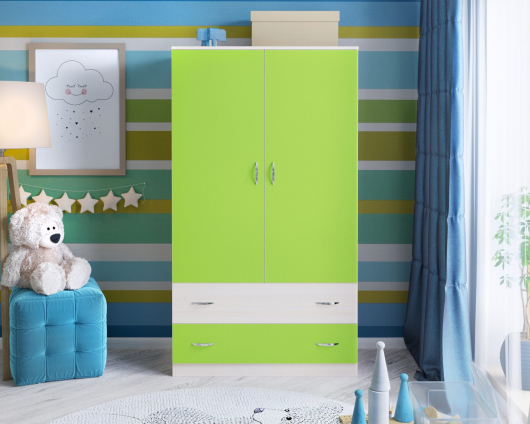 Шкаф двухстворчатый Ярофф условно разделен на две части. Нижняя часть представлена двумя выдвижными ящиками - для белья или игрушек. А за двумя распашными дверьми расположено множеством полок для одежды, а также штанга для вешалок-плечиков. Благодаря выбору цветового решения, вы подберете для своего ребенка ту самую модель, которая всем понравится. Данная модель поразит вас своей компактностью, вместительностью и практичностью. Шкаф выполняется без ножек.