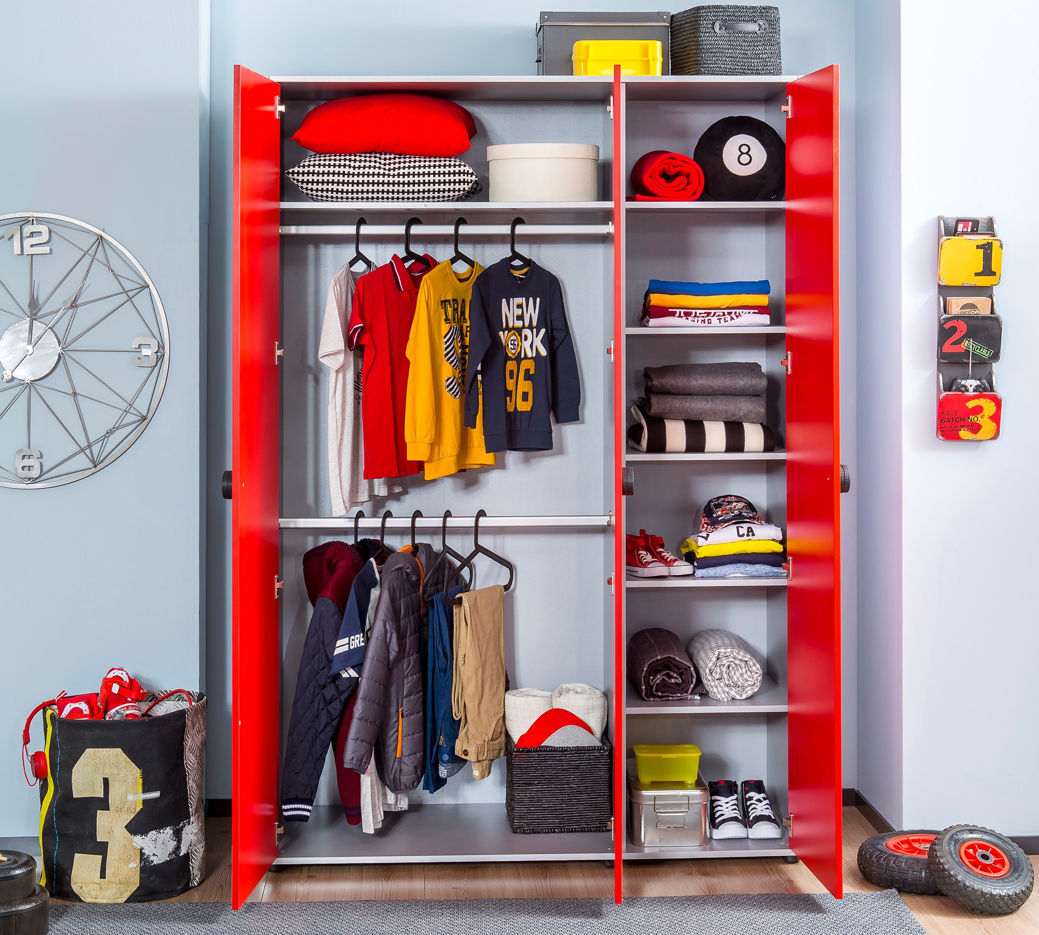 Шкаф 3-х дверный Racecup 20.56.1002.00 станет отличным дополнение уютного интерьера яркой детской комнаты. Изделие предоставит достаточно места для бережного хранения всего гардероба вашего ребенка. Две широкие штанги созданы для вешалок-плечиков с костюмами и другой выглаженной одеждой. Множество полок пригодятся для размещения другой одежды, белья, различных аксессуаров и коробок с обувью. Мебель Racecup позволит вашему малышу ощутить себя чемпионом - победителем Формулы-1.