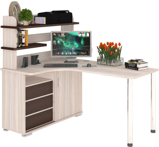Компьютерный стол СР-145м с небольшим стеллажом-надстройкой с ящиками и закрытой нишей. Столешница длинной 1400 мм. Ящики без ручек открываются по принципу "нажал-открыл". Глубина верхней полки позволяет свободно разместить оргтехнику.