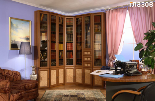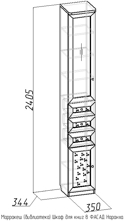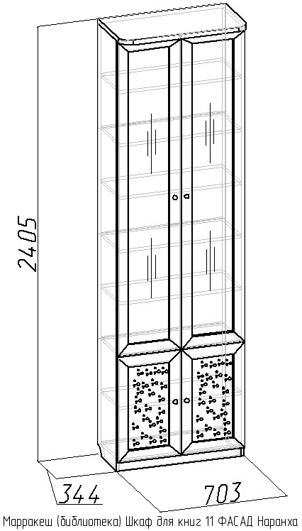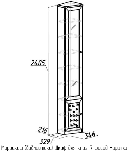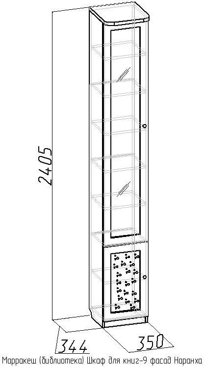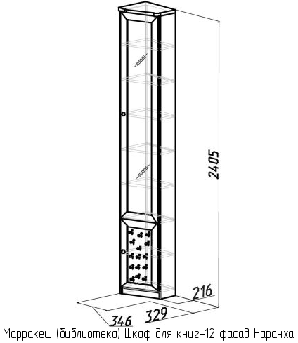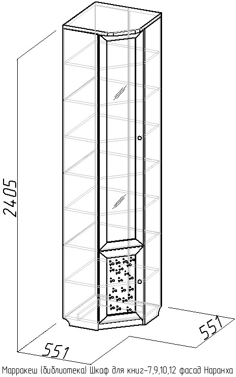 В состав библиотеки Марракеш (вариант 1) входят следующие элементы: шкаф для книг-7, шкаф для книг-8, шкаф для книг-9, угловой шкаф для книг-10, шкаф для книг-11, шкаф для книг-12, а также к каждому шкафу фасад Наранха.