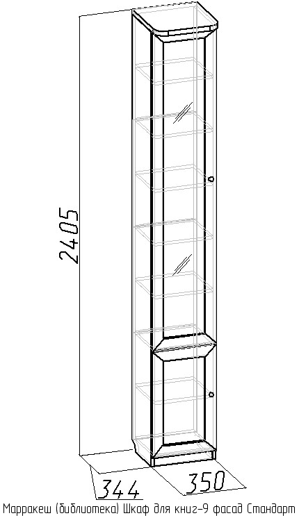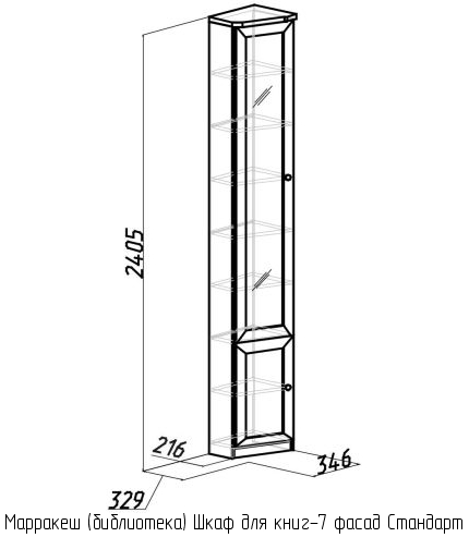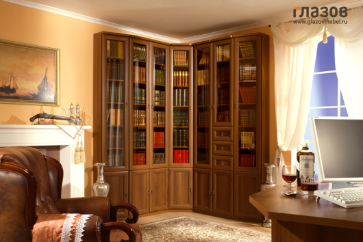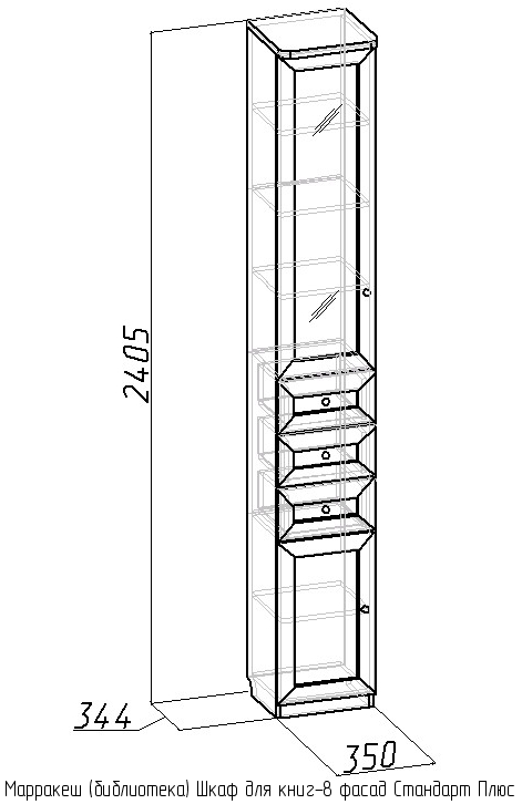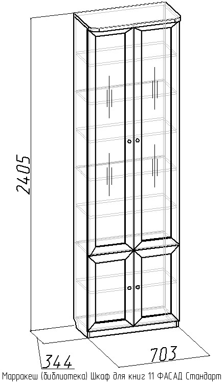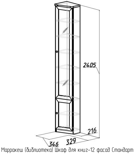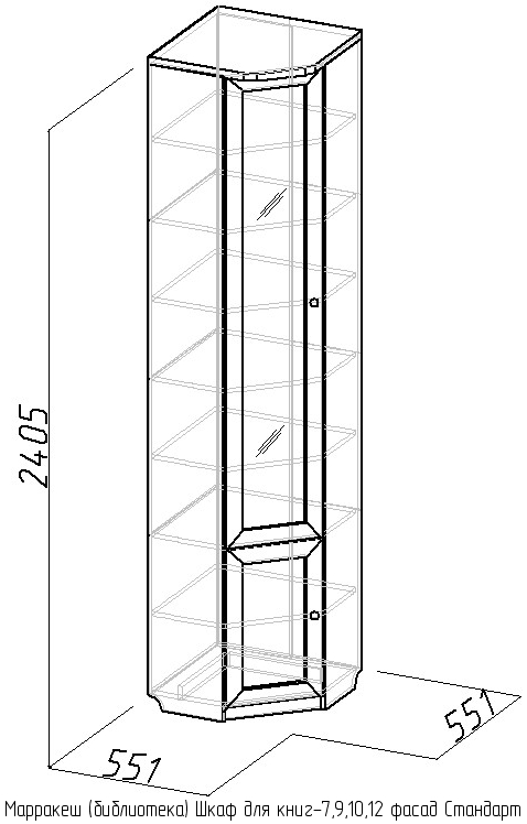 В состав библиотеки Марракеш (вариант 3) входят следующие элементы: шкаф для книг-8 с фасадом стандарт плюс; шкаф для книг-7, шкаф для книг-9, угловой шкаф для книг-10, шкаф для книг-11 и шкаф для книг-12 со стандартными фасадами.