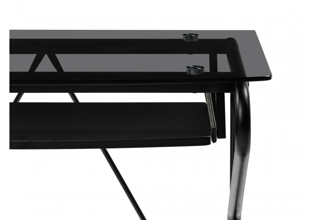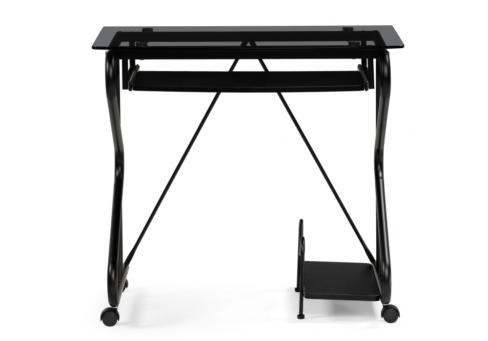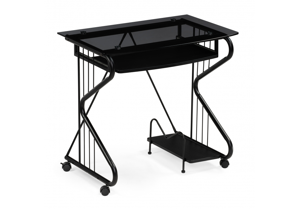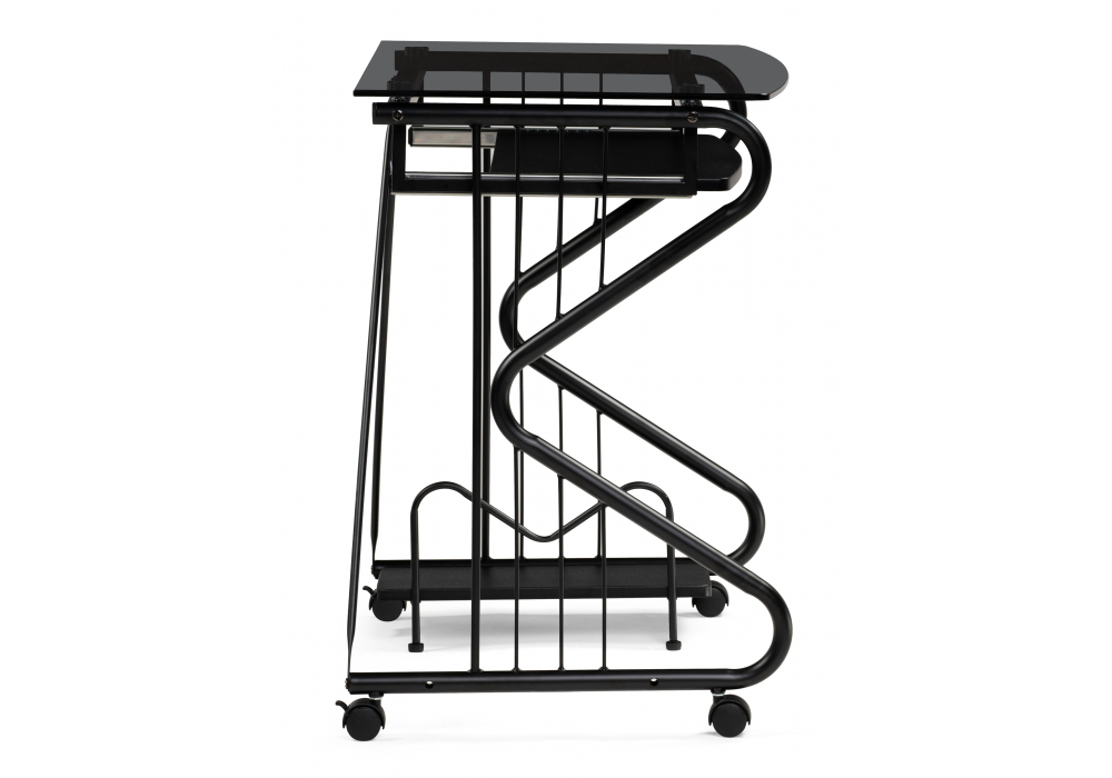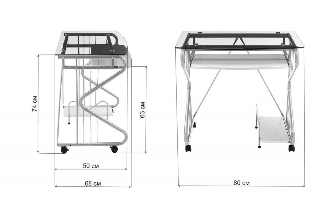 Функциональный компьютерный стол из стекла и металла. Есть выдвижная полка для клавиатуры и подставка для системного блока. Идеально подойдет для любого современного интерьера. -