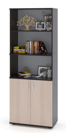 Широкий стеллаж высотой 1827 мм с тремя открытыми полками и закрытой секцией для хранения документов, архивов, оргтехники, предметов интерьера. Дверцы стеллажа предотвратят попадание пыли и солнечного света внутрь закрытого пространства.