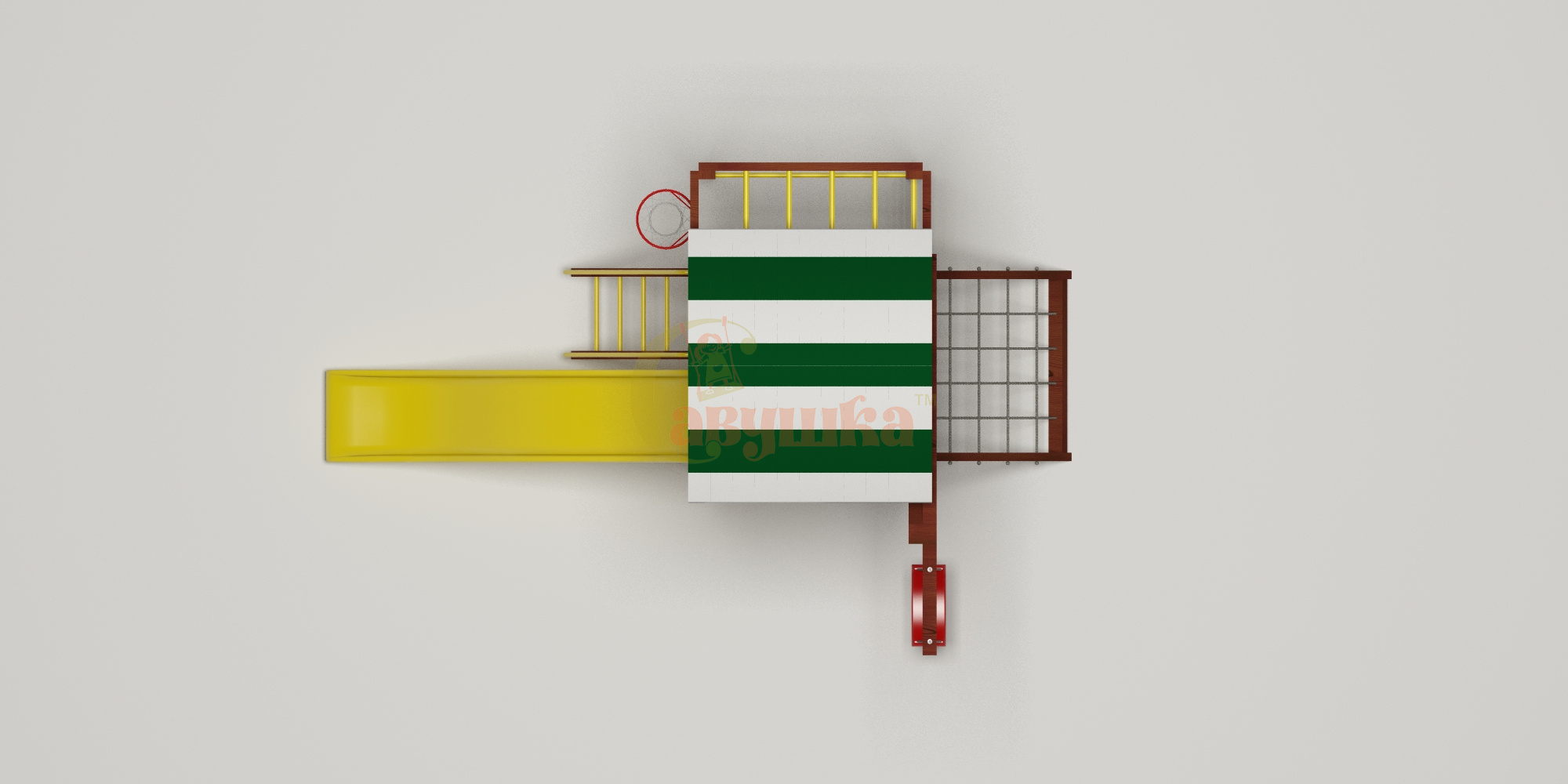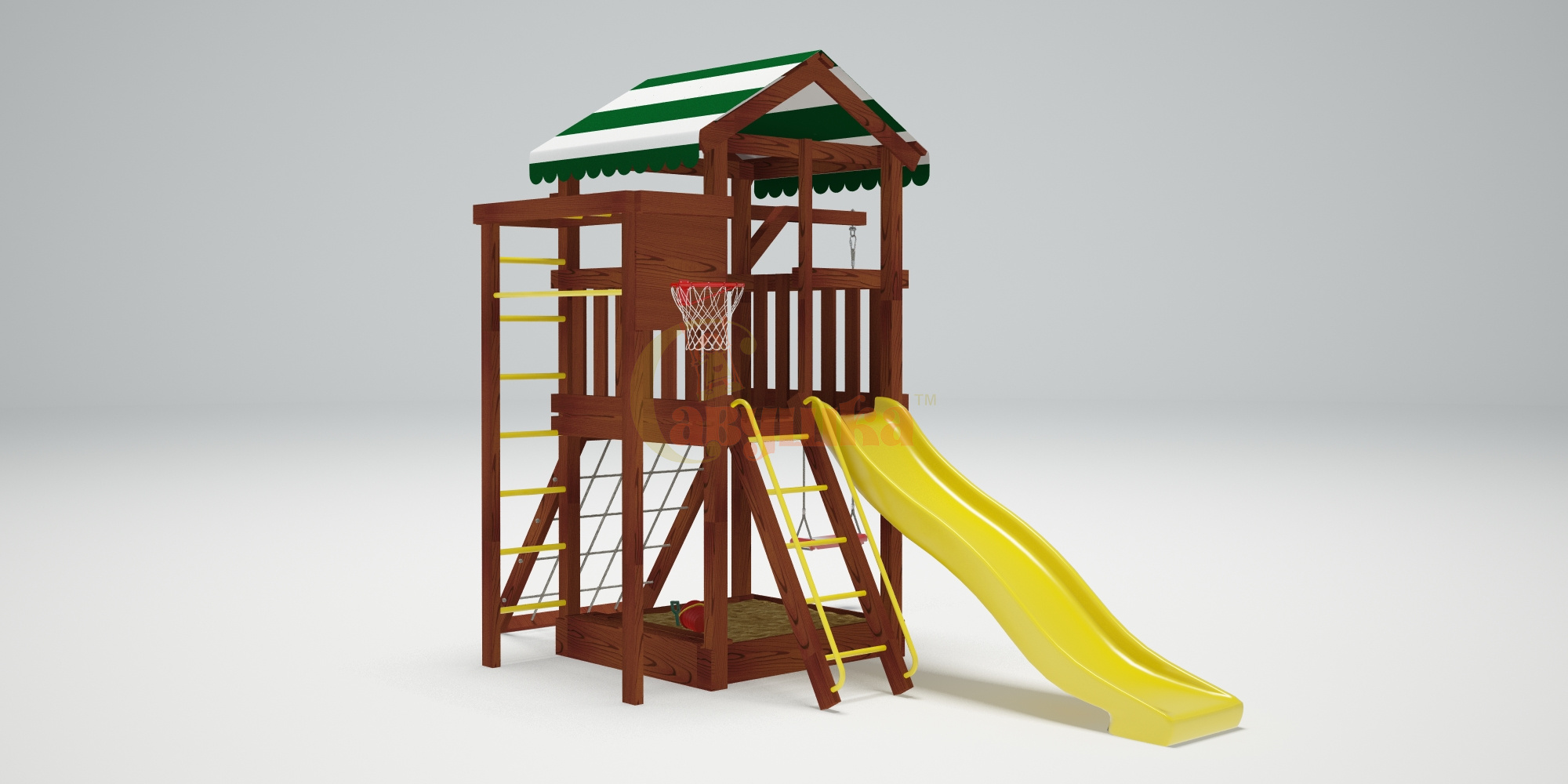 Комплектация: кольцо баскетбольное, лестница с металлическими ступенями и перилами, песочница, рукоход, сетка-лазалка в раме, турник металлический, шведская стенка, лавочка на песочницу.