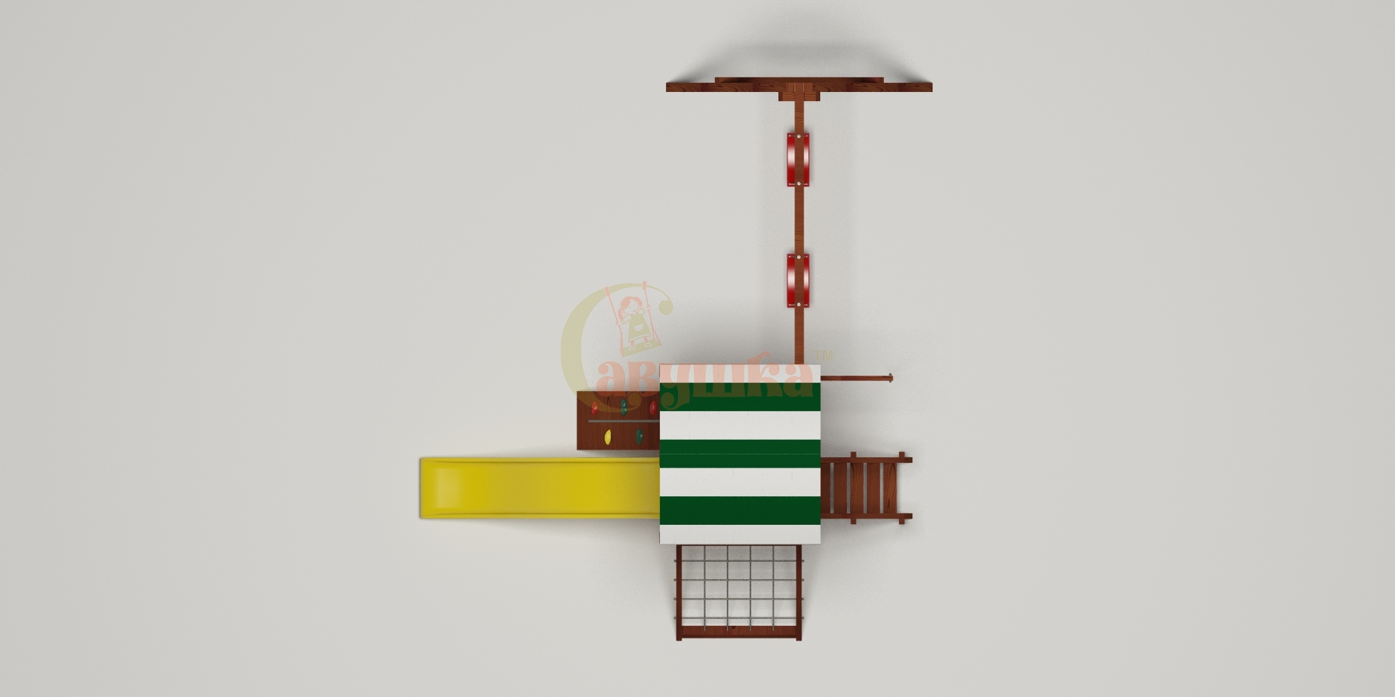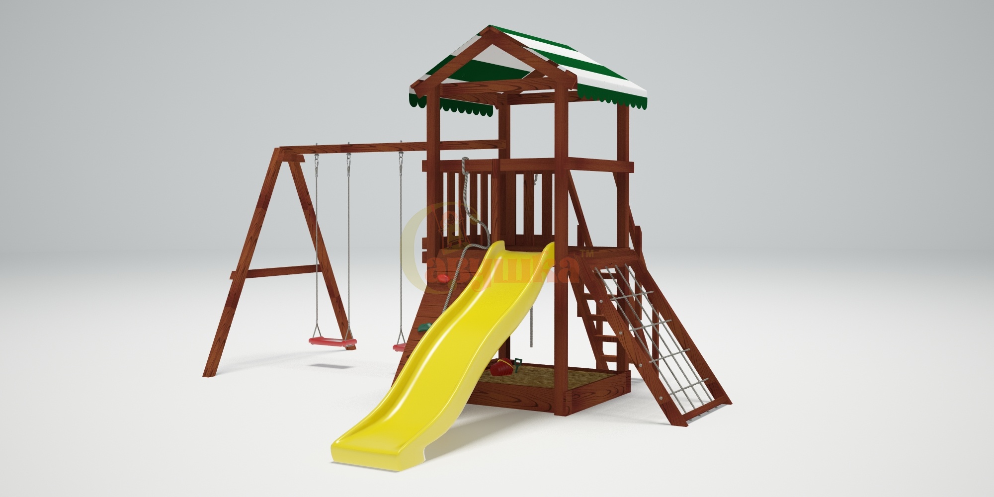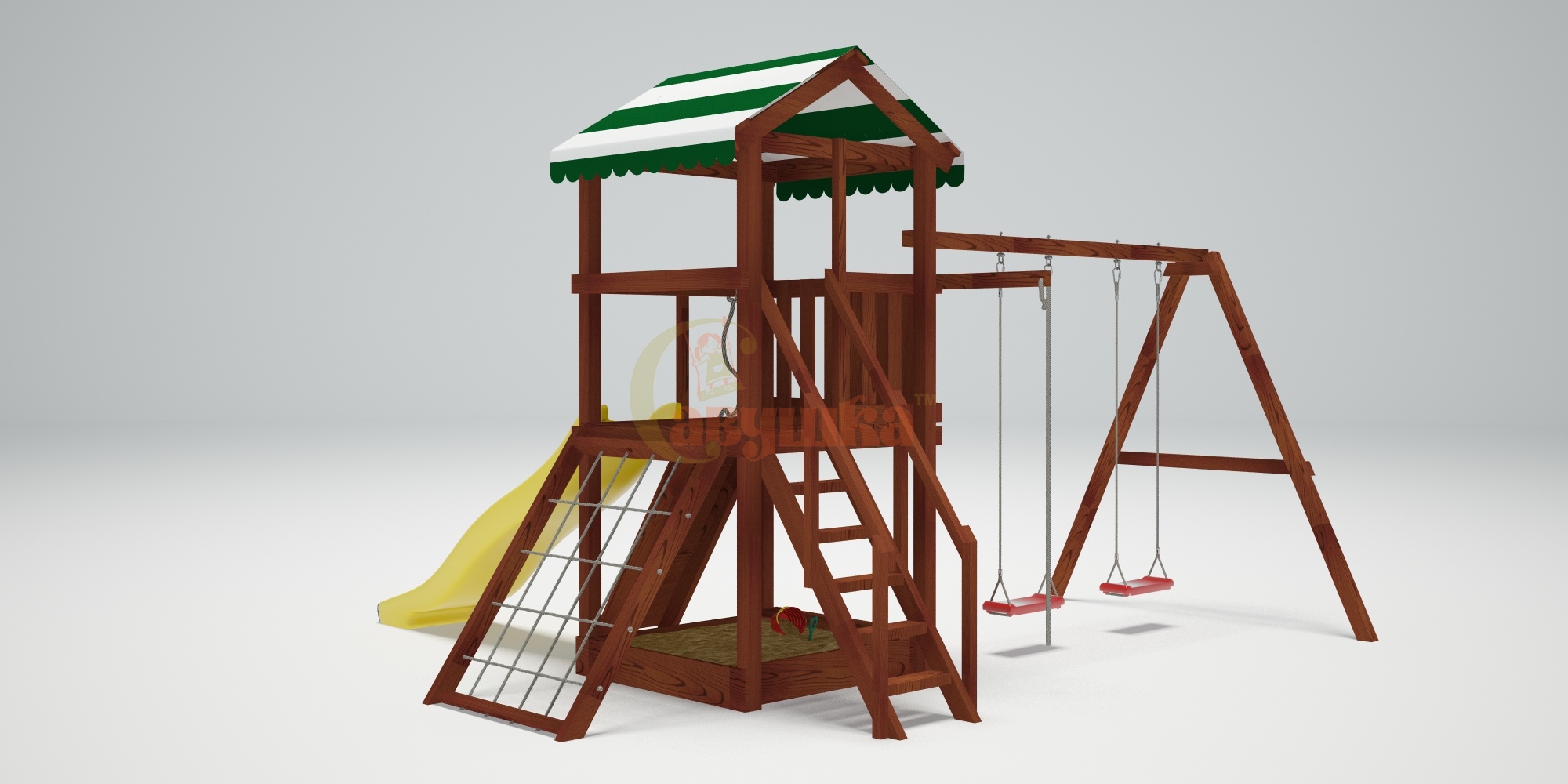 Комплектация: канат, качели Лодочка 2 шт., лестница с деревянными ступенями и перилами, песочница, сетка-лазалка в раме, стенка альпинистская, лавочка на песочницу.